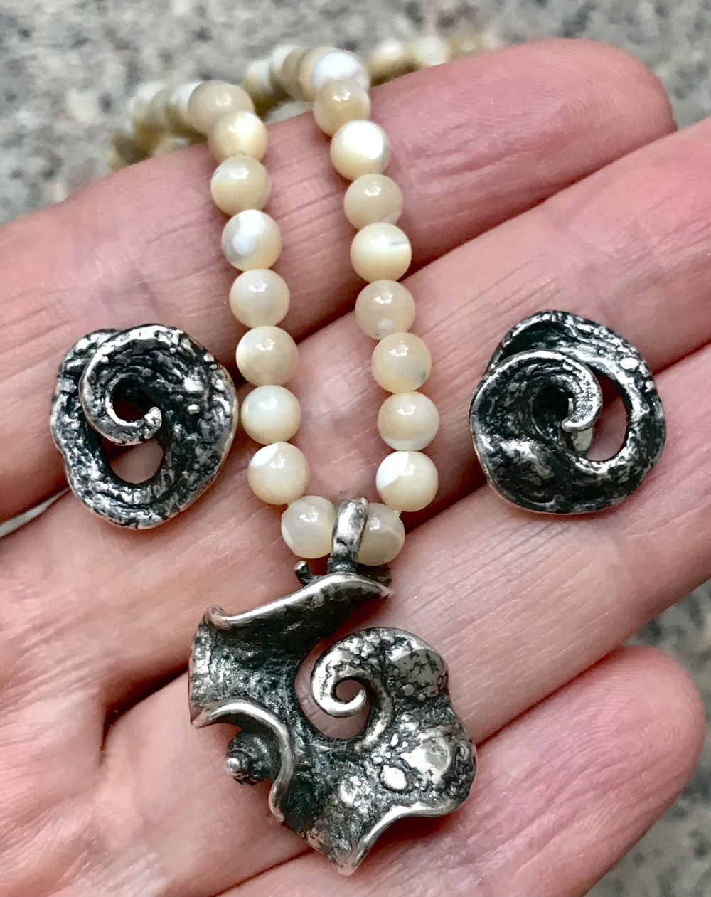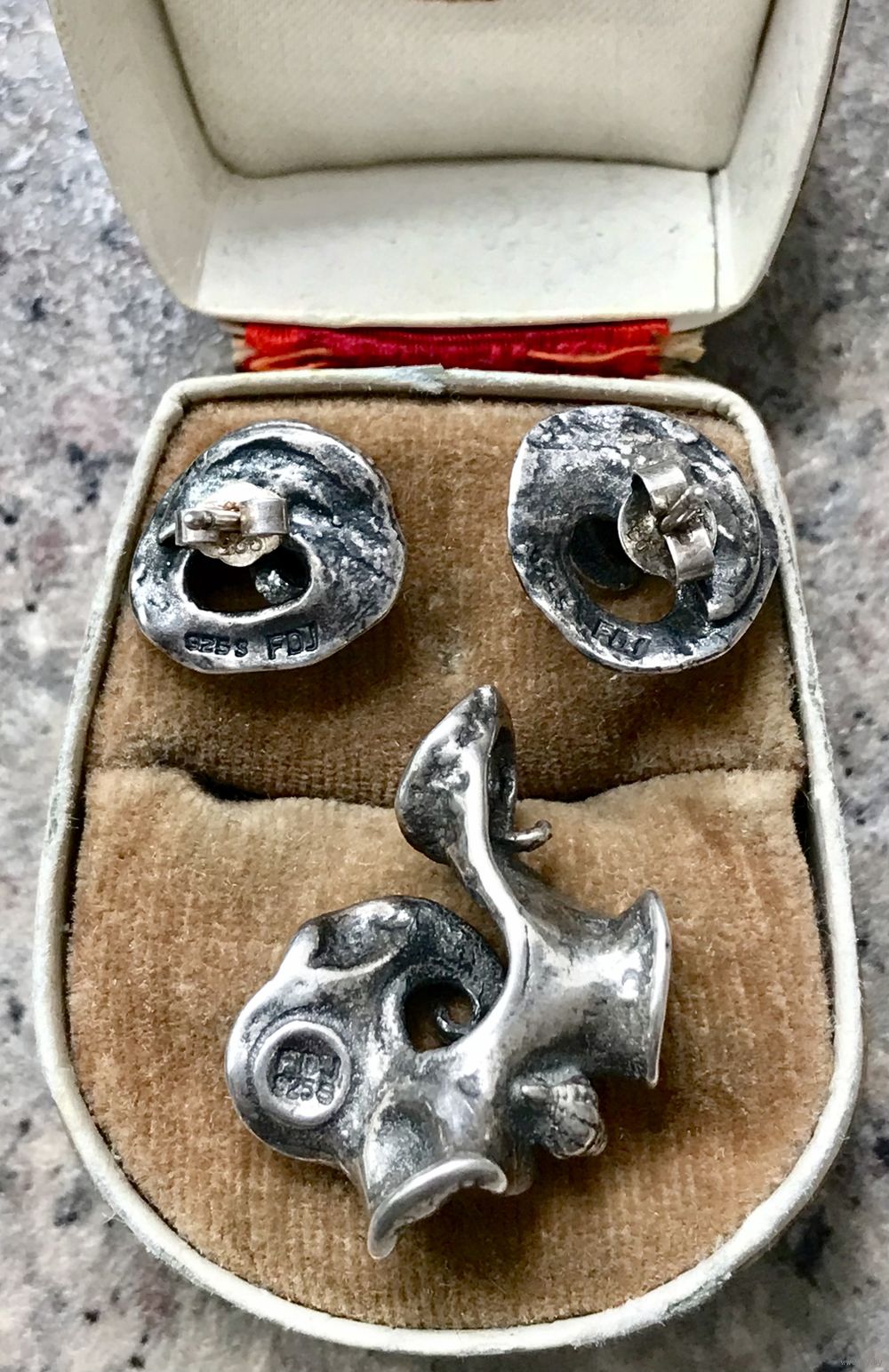 Винтажный комплект из серебра 925пр. известного датского бренда Flora Danica. Серьги-пусеты размером 1,5х1,3см., одна заглушки не родная. Размер кулона 2,7х2см. Общий вес украшений 10,74гр. Серьги и кулон маркированы, стоят отметки 925 S FDJ. Состояние хорошее.