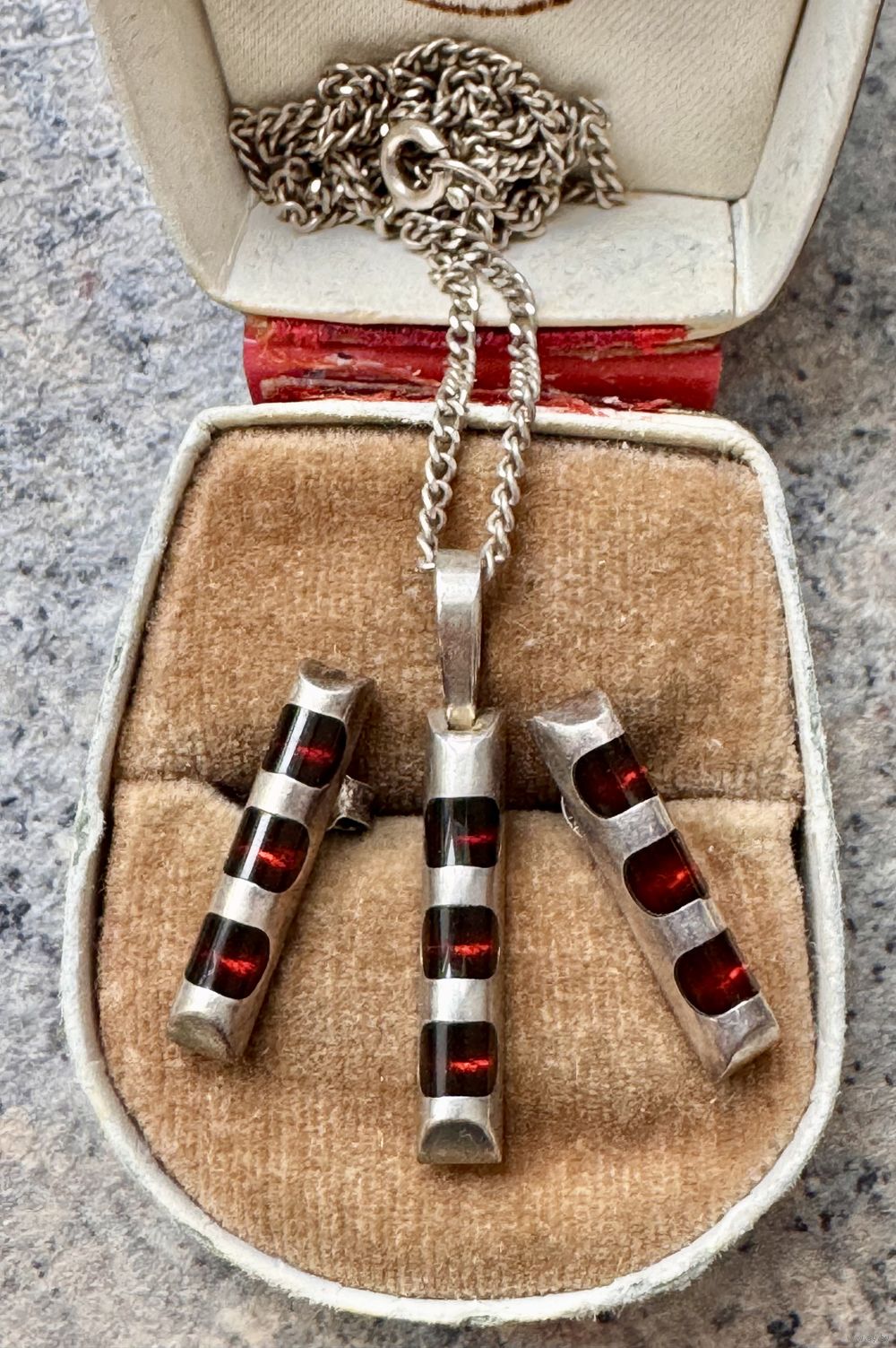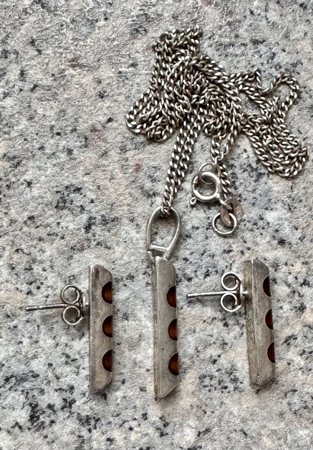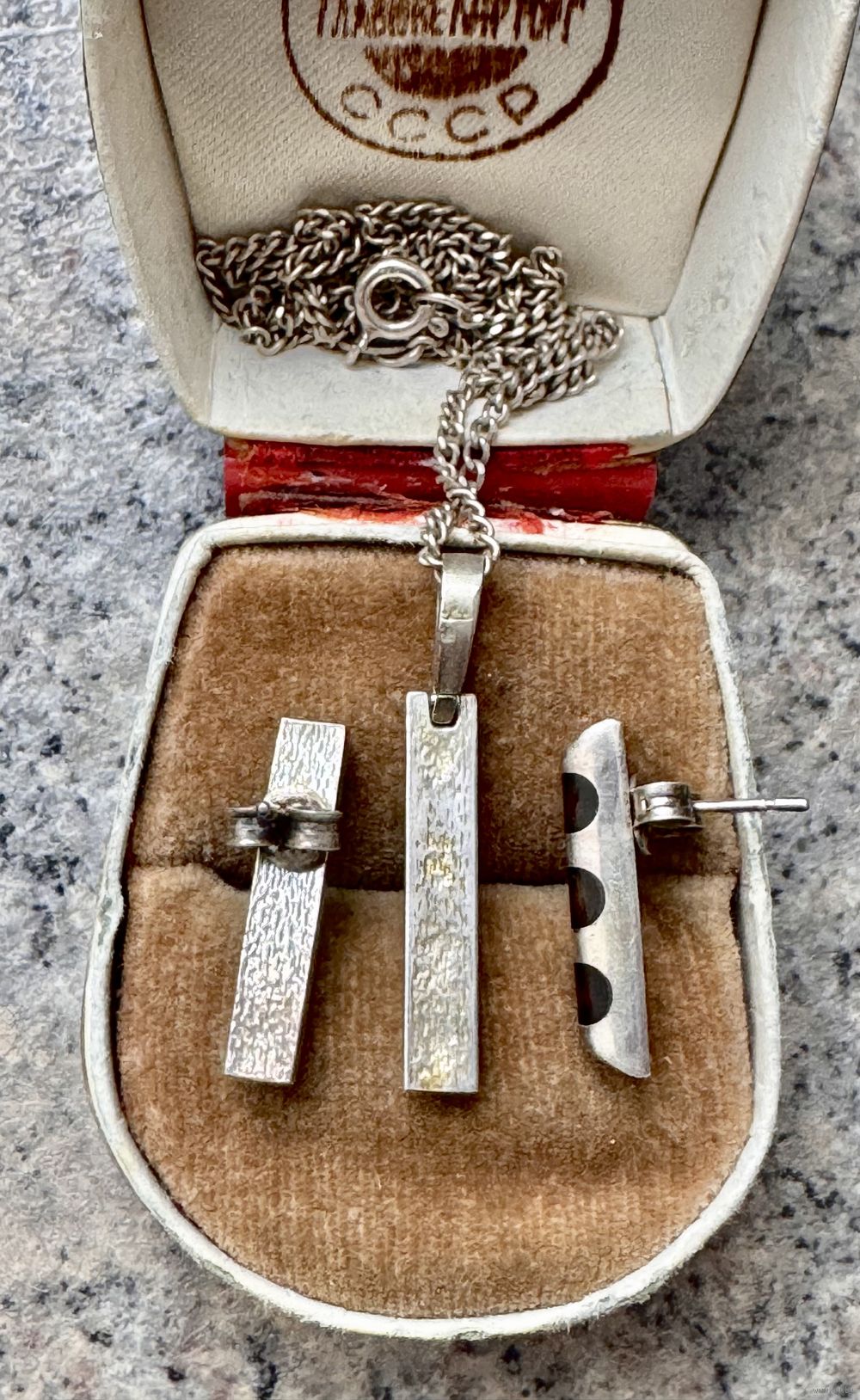 Комплект из серебра 925пр. (На каждом изделии стоит отметка 925 и надпись z/k на серьгах, на цепочке отметка 925 и надпись Nata). Размер серьги 2х0,4см., высота кулона с петлей 3см., длина цепочки 50см. Общий вес всех украшений 11,48гр. Состояние хорошее.