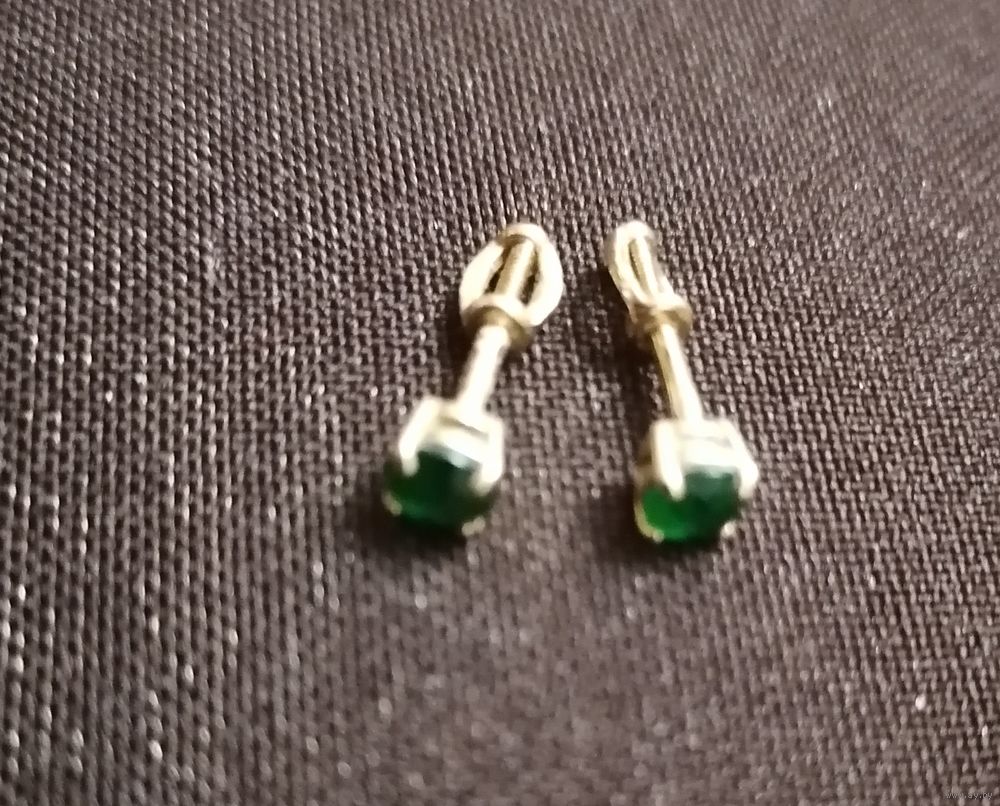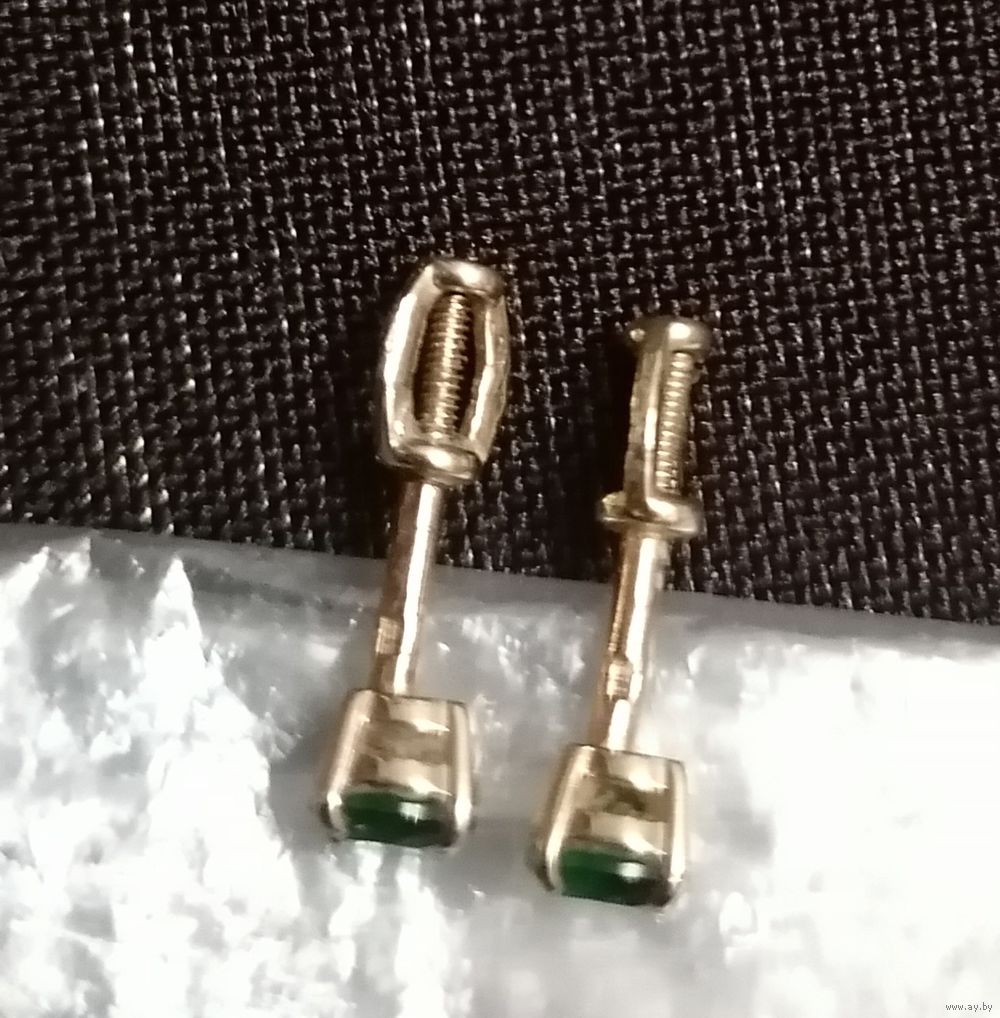 Изящные модные золотые сережки с зелеными натуральными камушками (изумруд или агат) и надежными замками - винтиками.