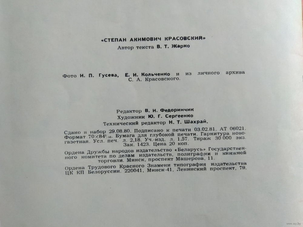 Шестьдесят лет своей жизни отдал Степан Акимович Красовский служению любимой Родине, созданию и укреплению ее Военно-Воздушных Сил, защите завоеваний Великой Октябрьской социалистической революции. В этом Степан Акимович видит свой долг коммуниста, долг гражданина СССР, в этом он видит счастье своей жизни. Свернуть Серия: Жизнь-подвиг Издательство: Беларусь