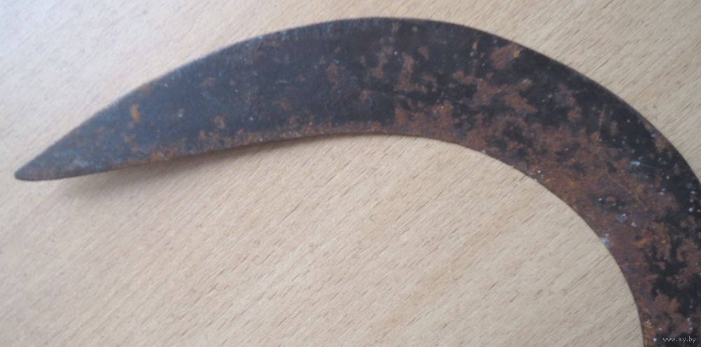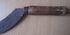 Лезвие широкое без зазубрин. Изгиб крутой. Длина лезвия (прямо) 24 см. Кончик в дереве загнут.