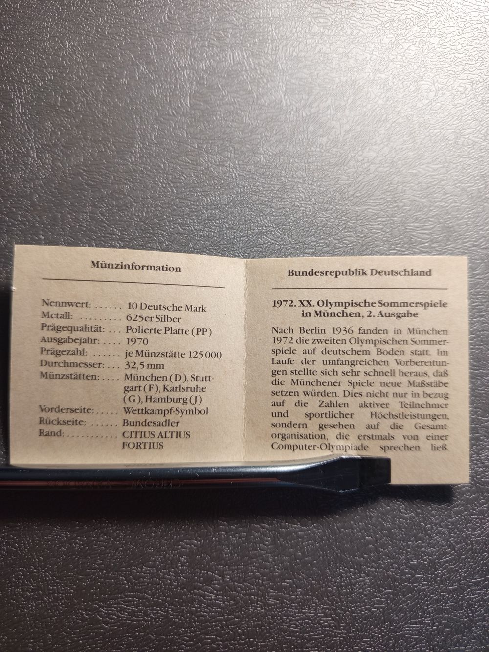 Сертификат к монете 10 марок ФРГ 1970 Олимпиада 1972 Мюнхен