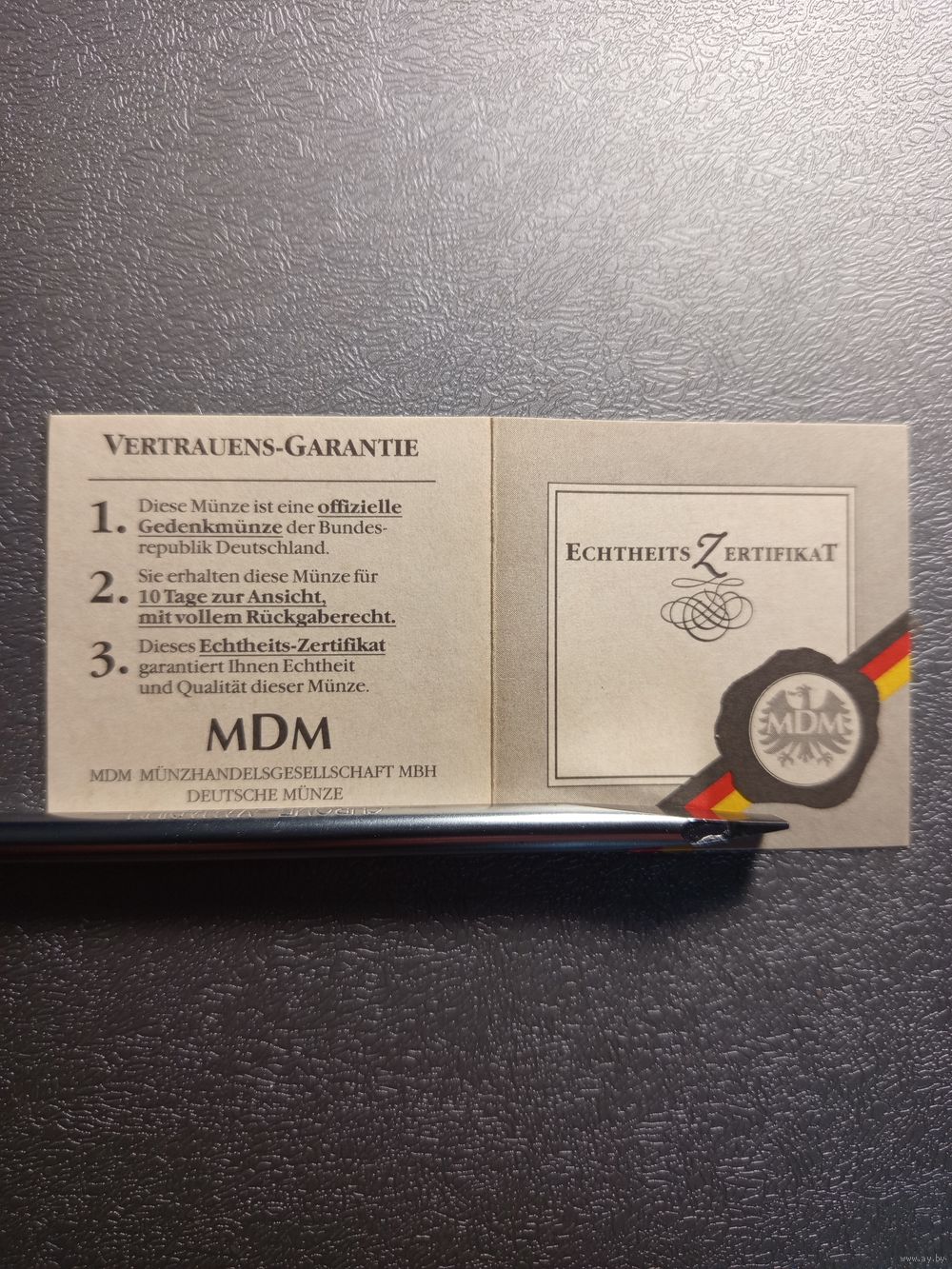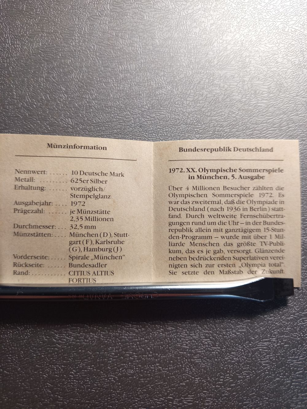 Сертификат к монете 10 марок ФРГ 1972 Олимпиада 1972 Мюнхен