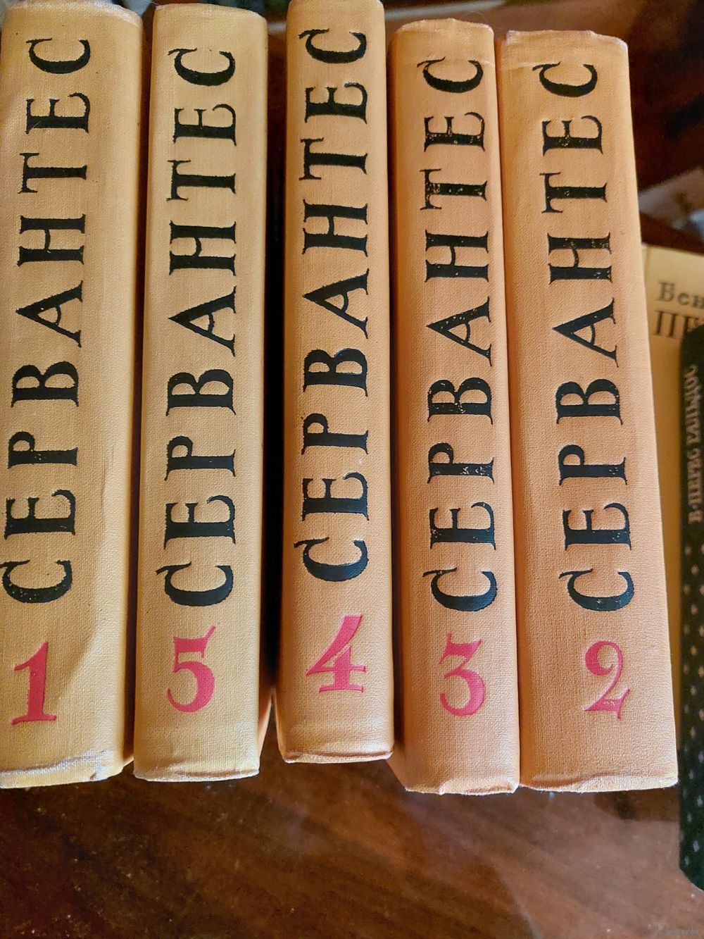 СОДЕРЖАНИЕ : Том 1. Дон Кихот Ламанчский, часть 1. Том 2. Дон Кихот Ламанчский, часть 2. Том 3. Назидательные новеллы: Пролог к читателю. Посвящение дону Педро Фернандесу де Кастро. Посвятительные стихи. Цыганочка. Великодушный поклонник. Ринконете и Кортадильо. Английская испанка. Лиценциат Видриера. Сила крови. Ревнивый эстремадурец. Высокородная судомойка. Две девицы. Сеньора Корнелия. Том 4. Назидательные новеллы: Обманная свадьба. Новелла о беседе собак. Подставная тетка. Послание к Матео Васкесу. Галатея. Путешествие на Парнас. Драматические произведения: К читателю. Нумансия. Интермедии. Саламанкская пещера. Театр чудес. Два болтуна. Ревнивый старик. Судья по бракоразводным процессам. Бискаец–самозванец. Избрание алькальдов в Дагансо. Бдительный старик. Вдовый мошенник, именуемый Трампагос. Том 5. Странствия Персилеса и Сигизмунды.