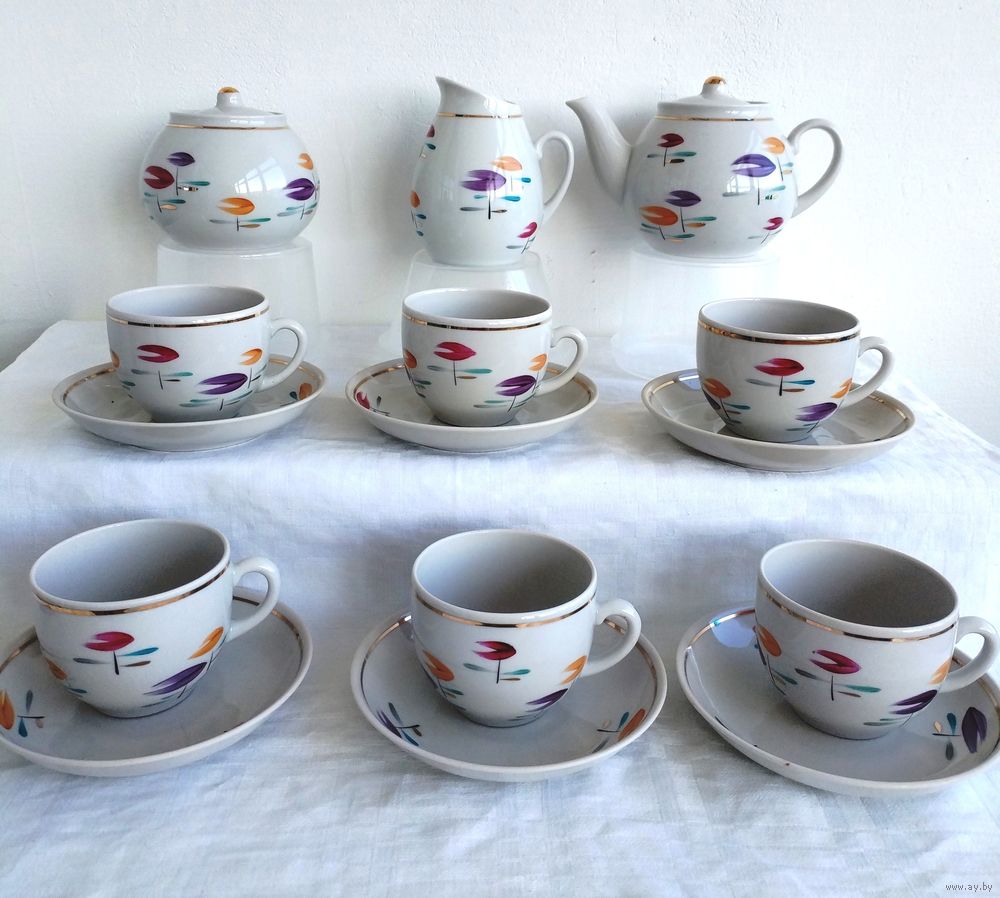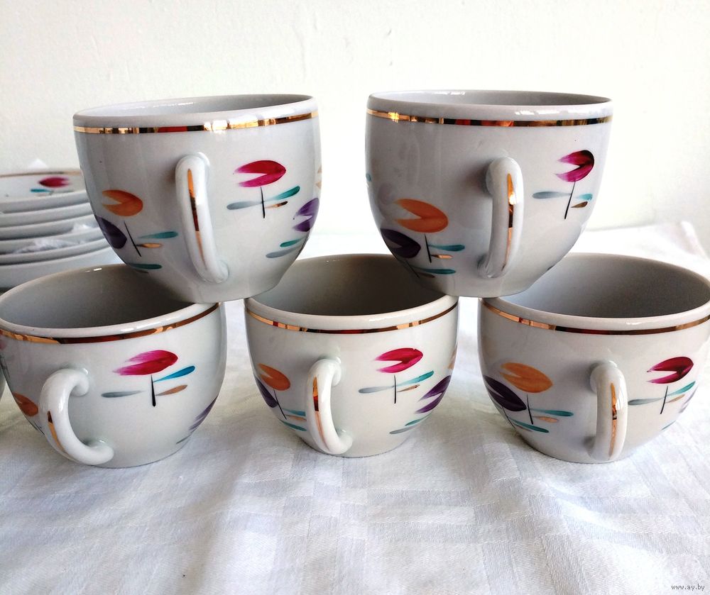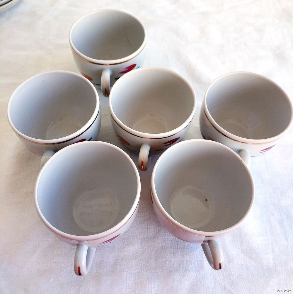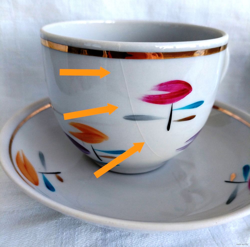 Все в отличном состоянии, кроме одной чашки с трещиной.