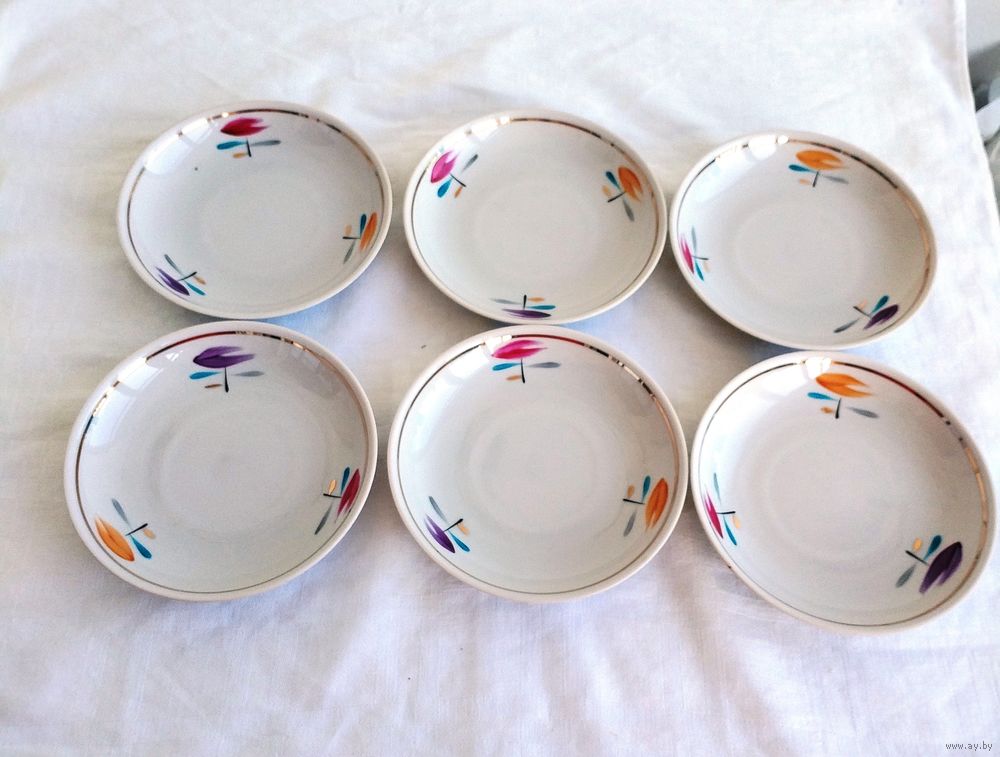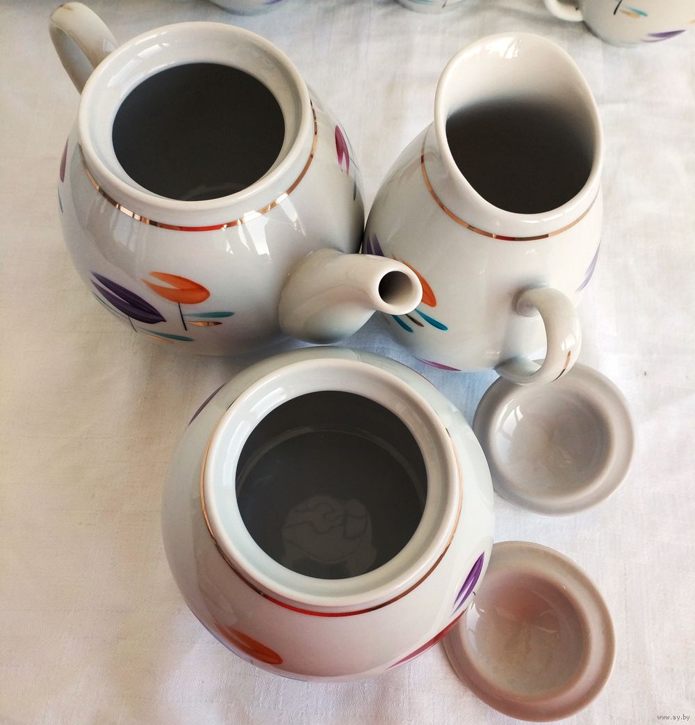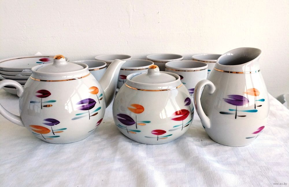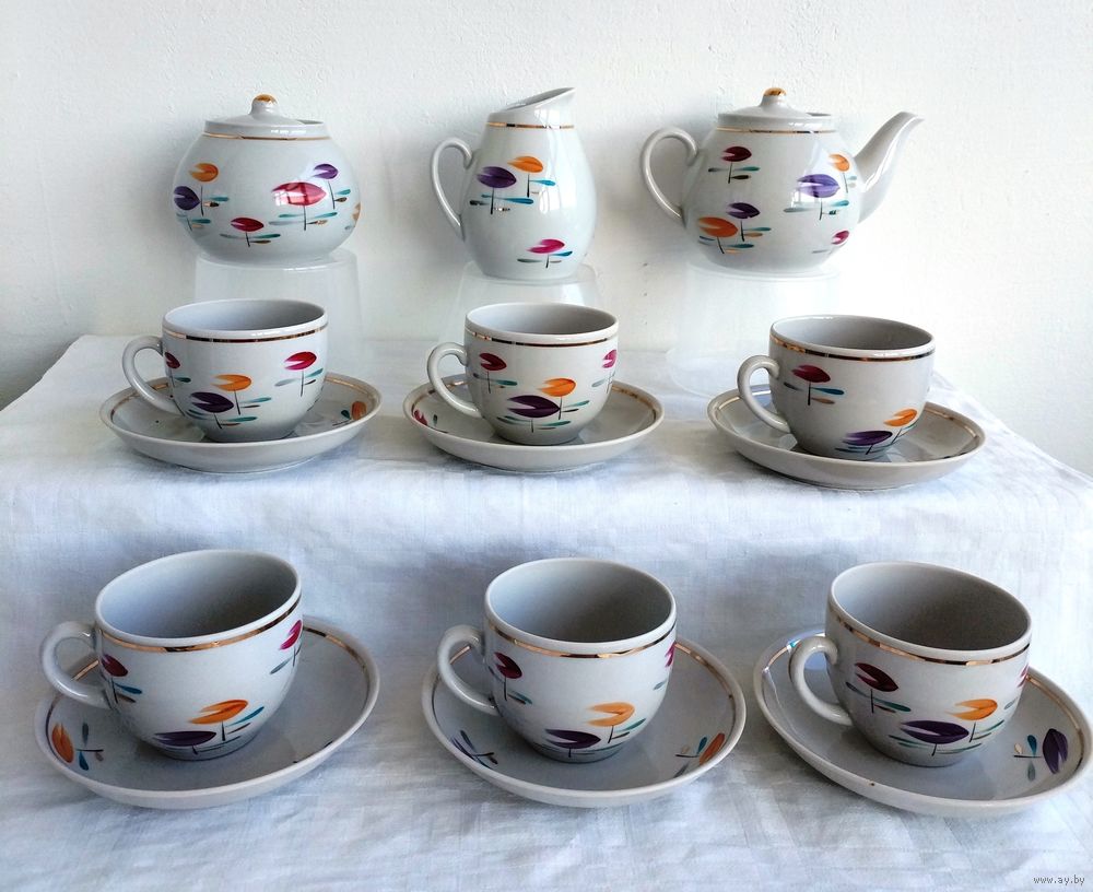 Все в отличном состоянии, кроме одной чашки с трещиной.