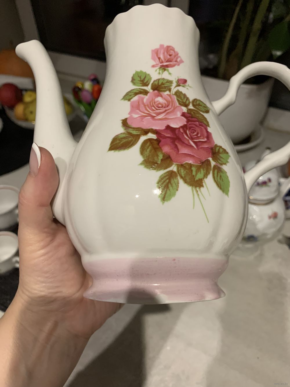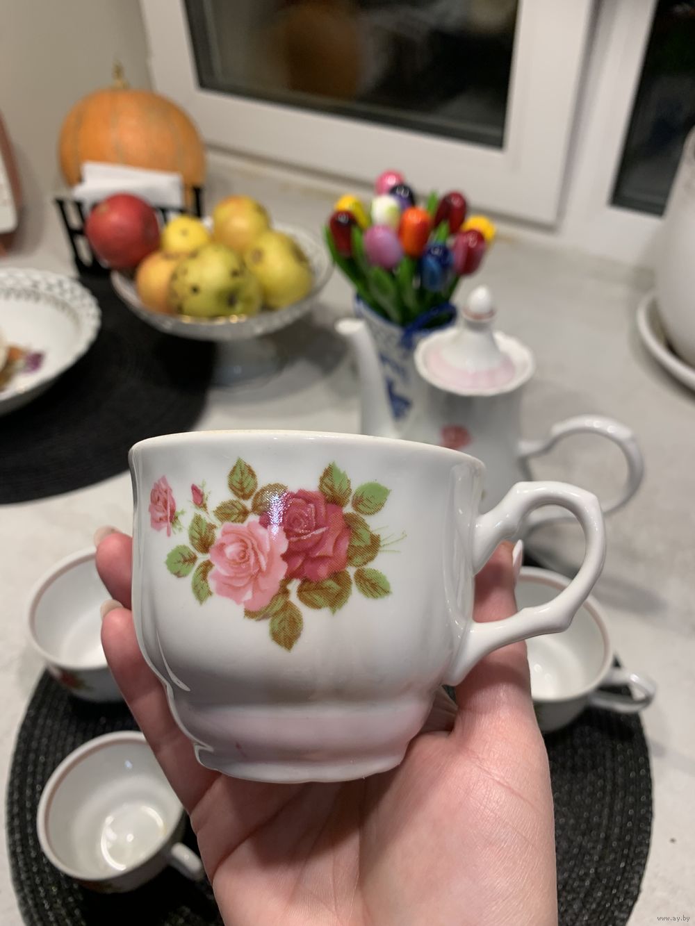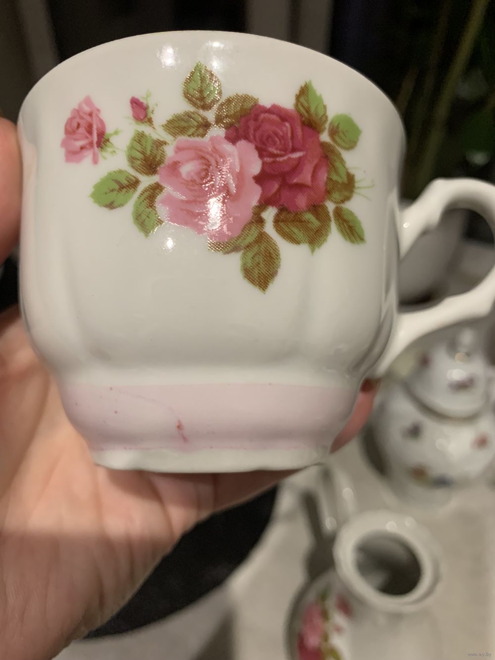 Остатки фарфорового сервиза (чашки и большой чайник). В отличном состоянии: нет сколов, трещин, потертости крытья, схода рисунка. Каждый предмет имеет красивые "юбочки"