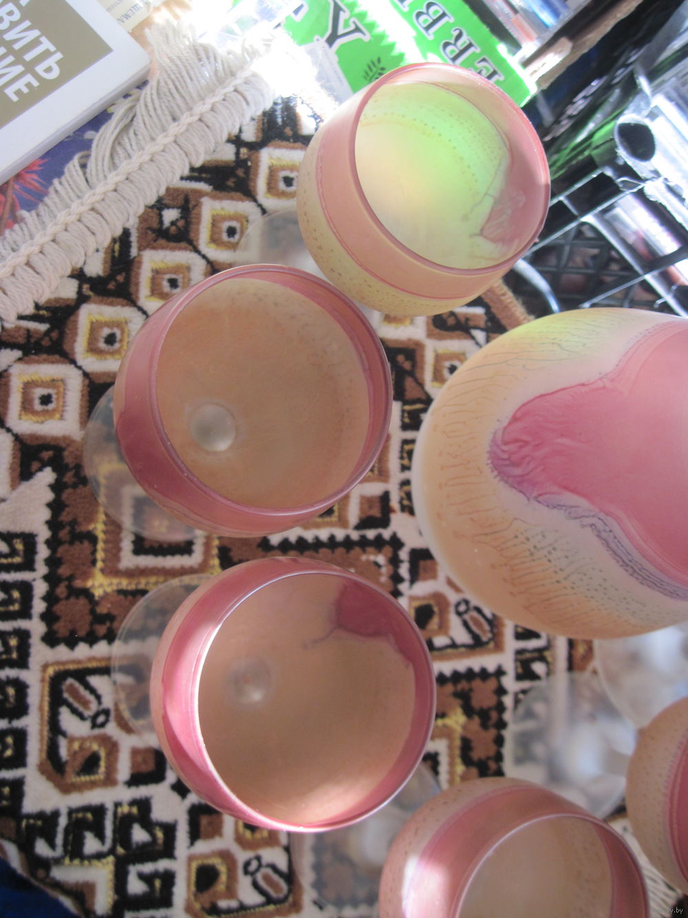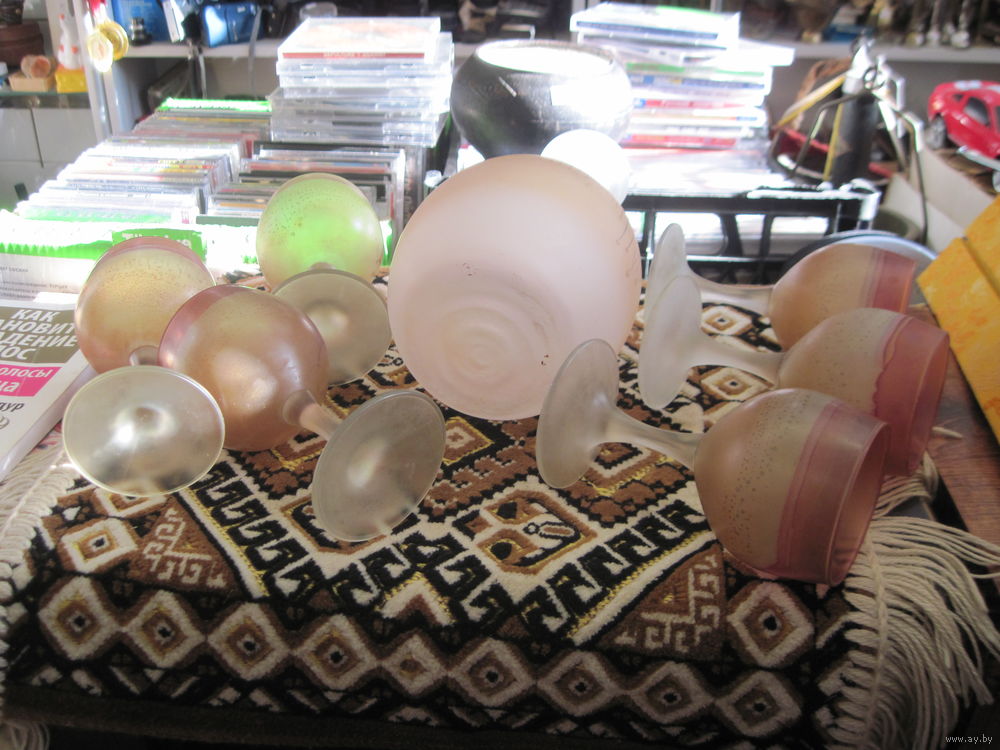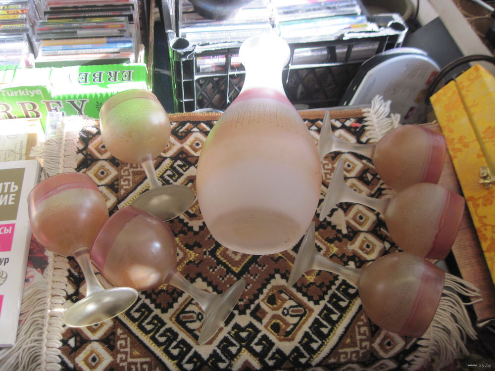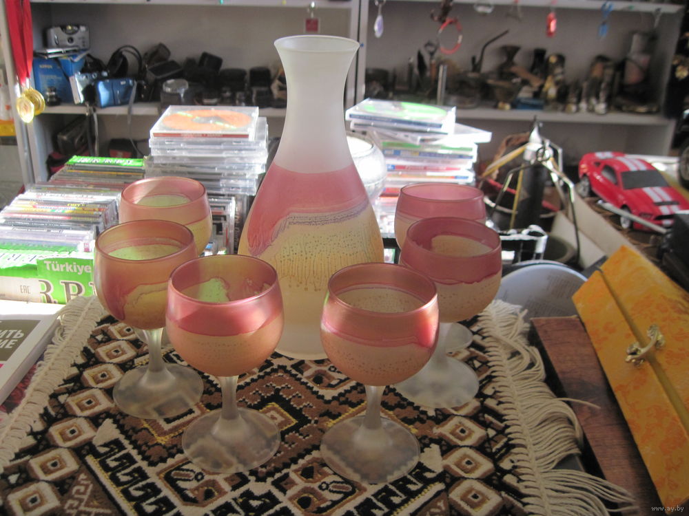 Сервиз для вина(графин и 6 рюмок). Матовое цветное стекло. Иордания.