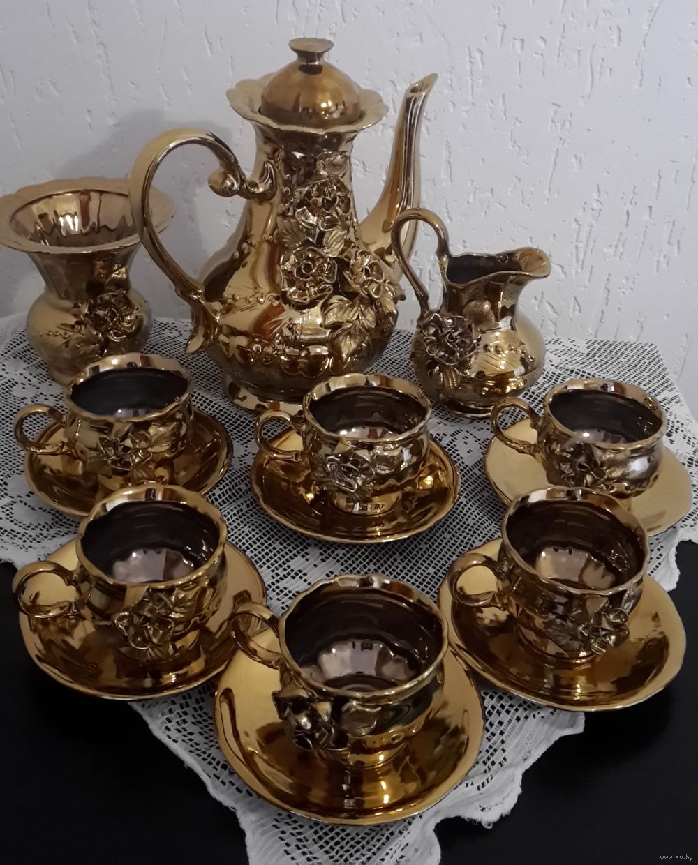 Сервиз б/у. Полный (с блюдцами). 15 предметов. Фарфор. Особый интерес вызывает декор. Цветы и листья изготовлены также из фарфора.