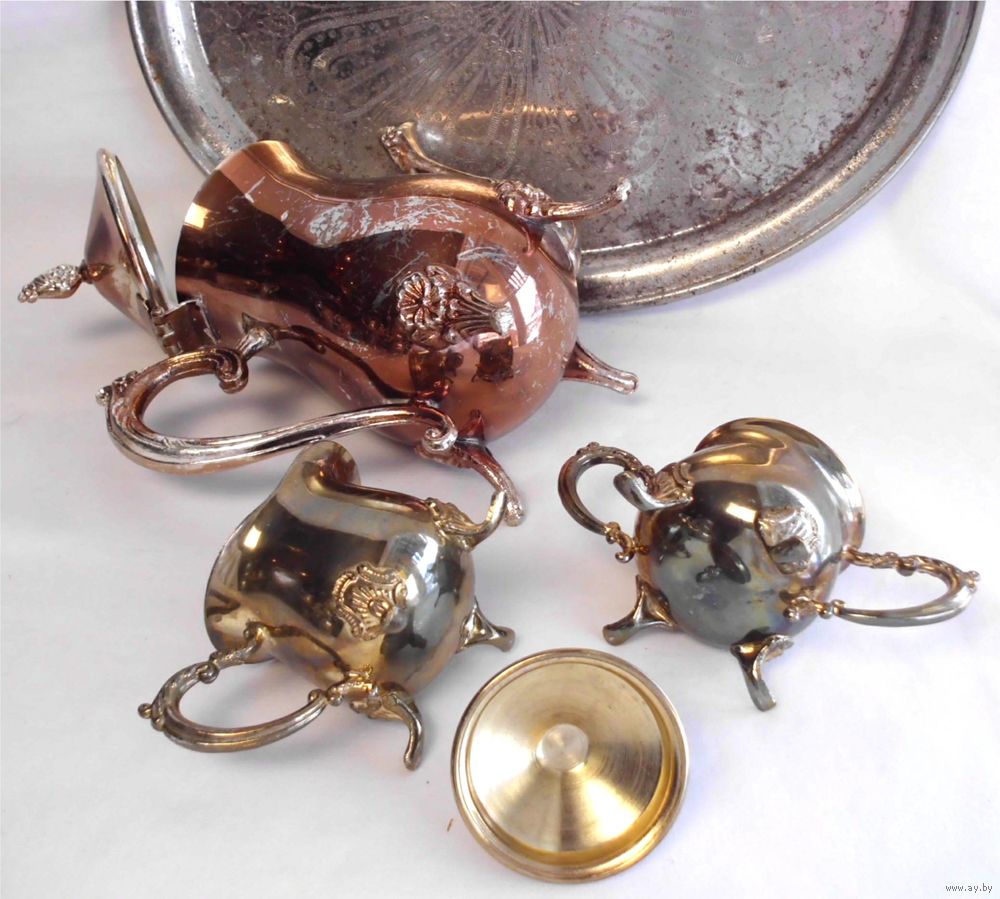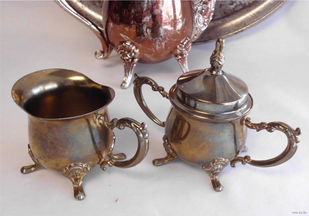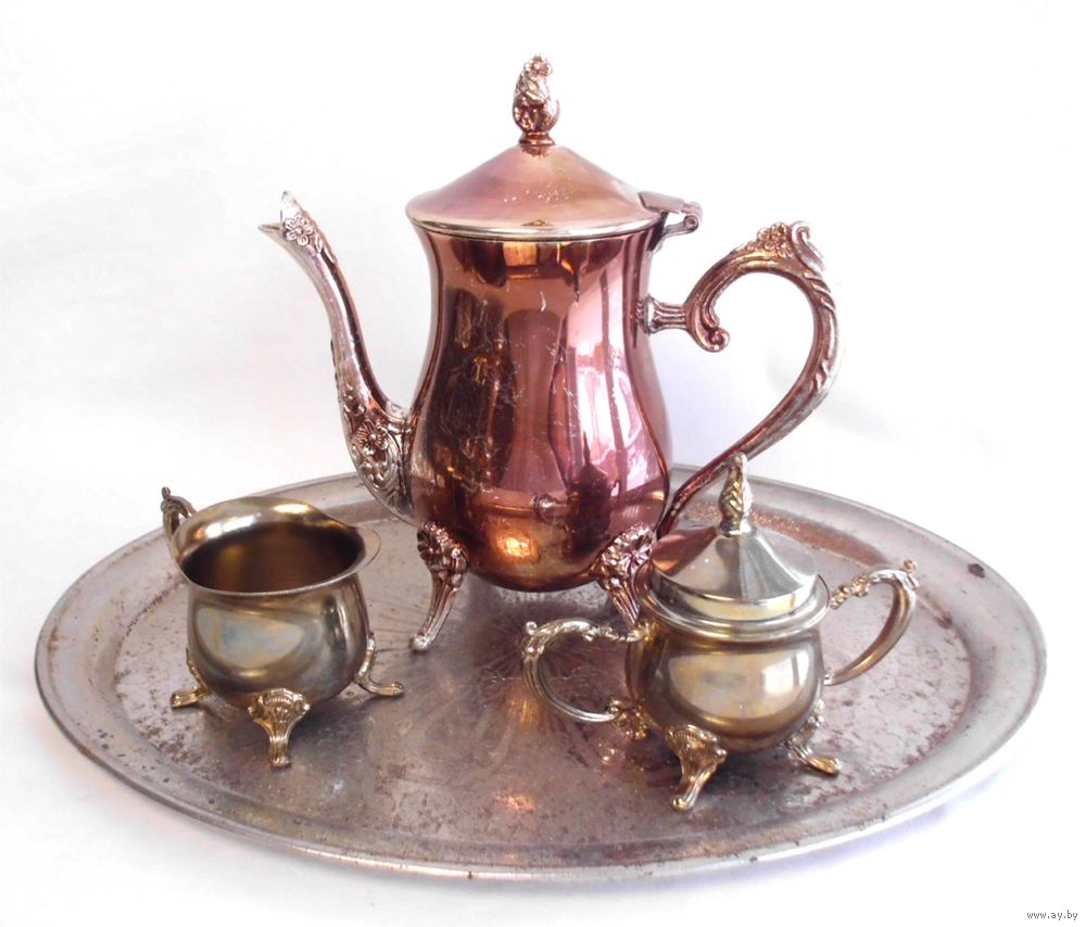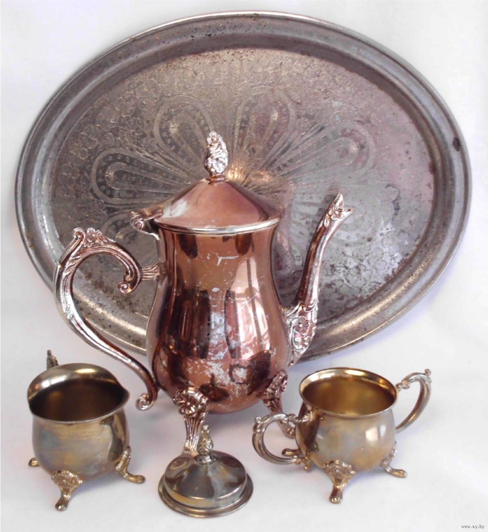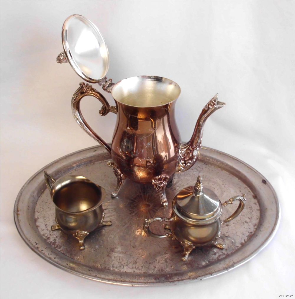 Кофейник, сливочник, сахарница - хромарган, анодирование; поднос - сталь.