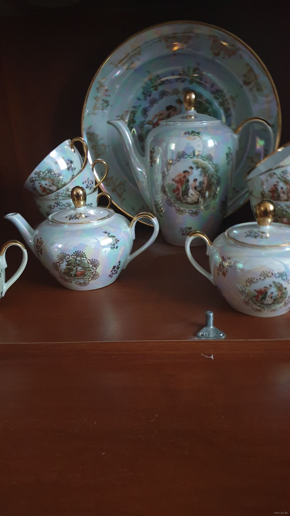 Чано кофейный сервиз на 6персон немецкой фирмы Фортуна.Состоит Кофейник объём 1,5л чайник заварочный объём 0,5л, сахарница, сливочник, шесть чашек объём 250мл, шесть блюдец, шесть розеток,большое блюдо 32см для пирожных,шесть десертных тарелок диаметр 19см.
