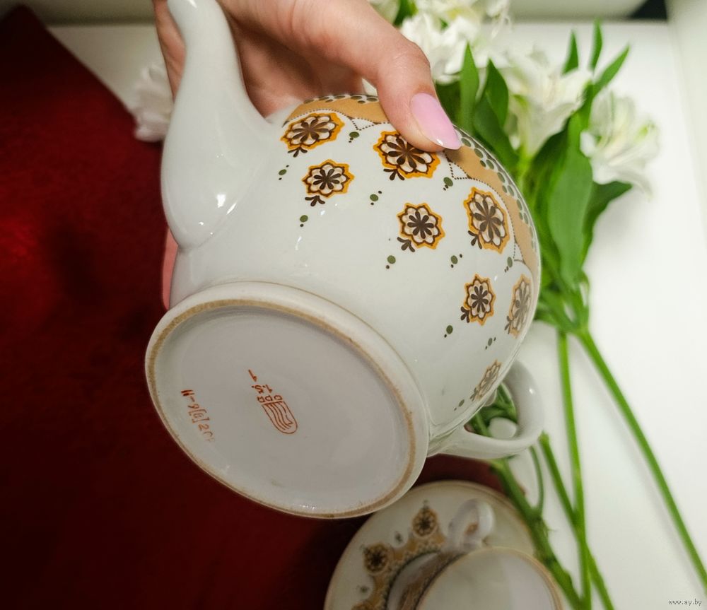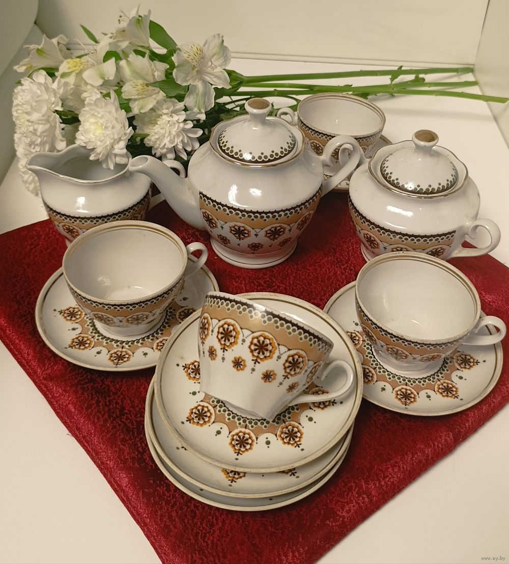 | Все целые.6 десертных тарелок, 4чашки, заварник, сахарница, молочник. | |