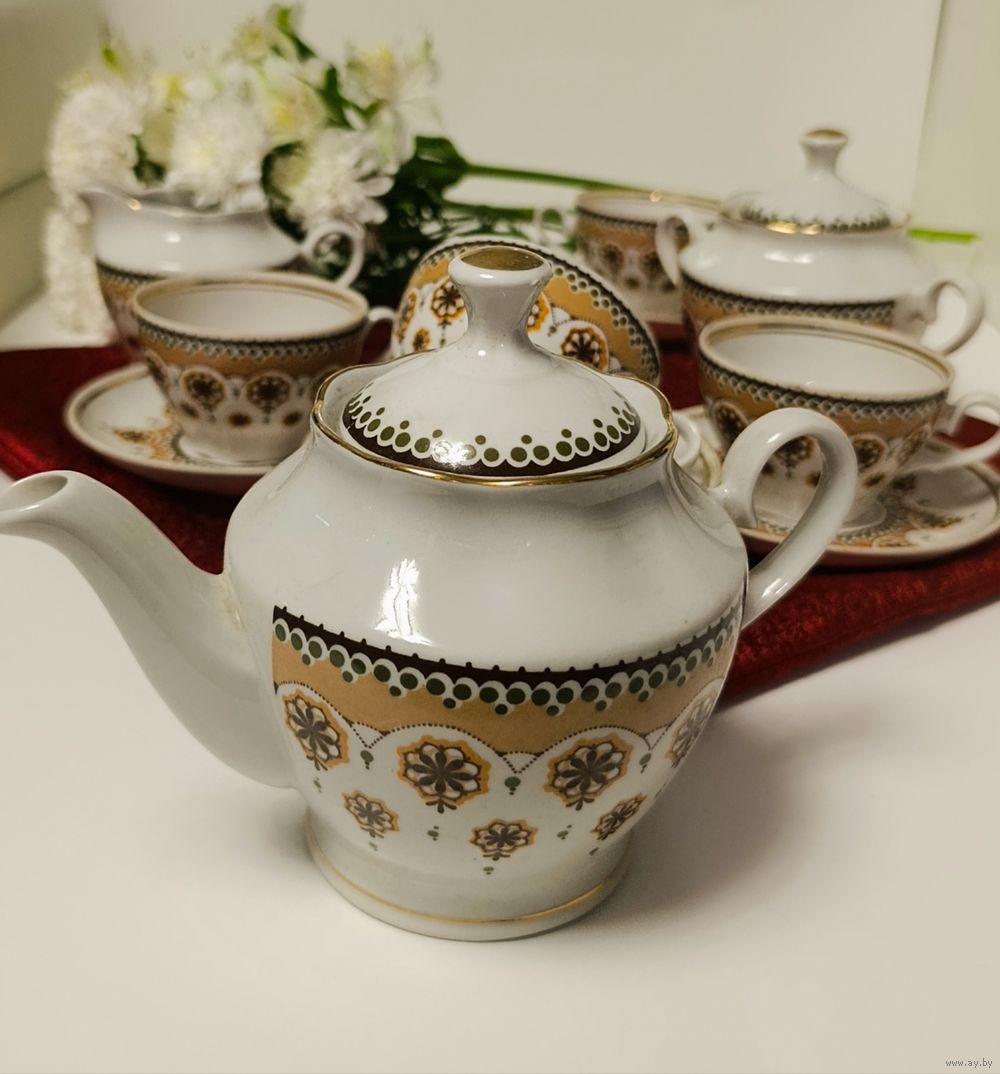 Стильный, редко встречающийся сервиз.Украшен геометрическим орнаментом в шоколадно-коричневых тонах, деколь, золочение.