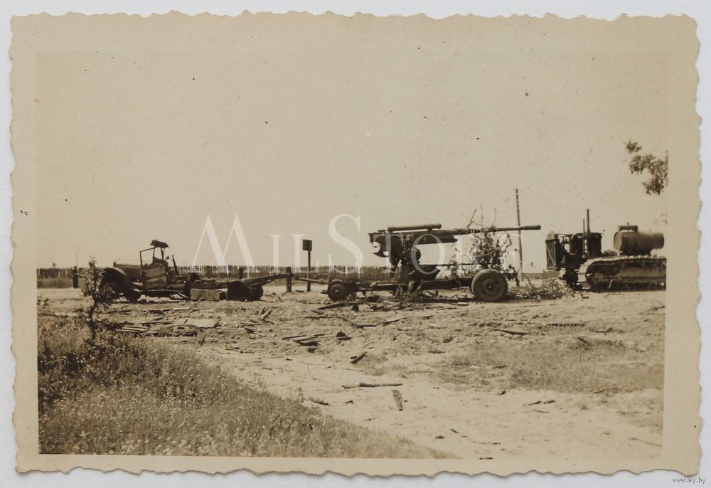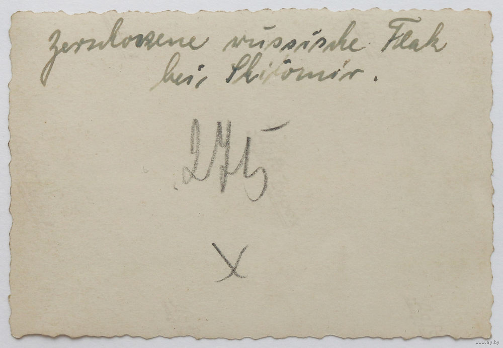 Сгоревший советский автомобиль ЗИС-5 с прицепленной 85-мм зенитной пушкой образца 1939 года 52-К и тягач С-60 "Сталинец" у Житомера. Размер 5,9 см. х 8,7 см.
