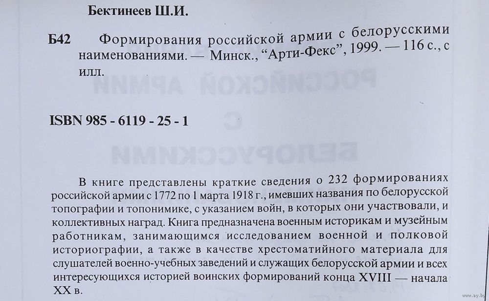 Ш. И. Бектинеев. Формирования российской армии с белорусскими наименованиями. Минск : АРТИ-ФЕКС, 1999 г. 115 с. Мягкая обложка. Увелич. формат.