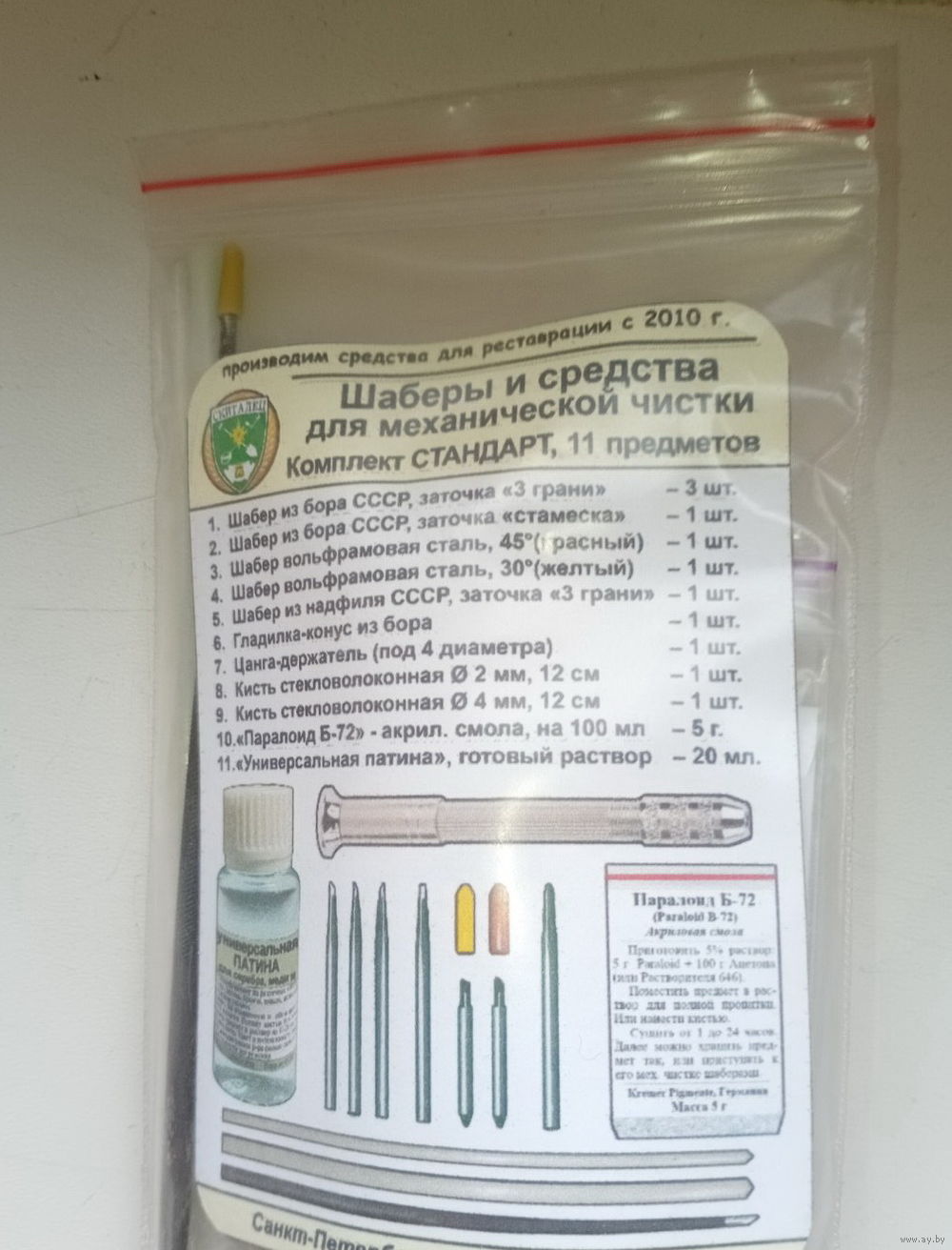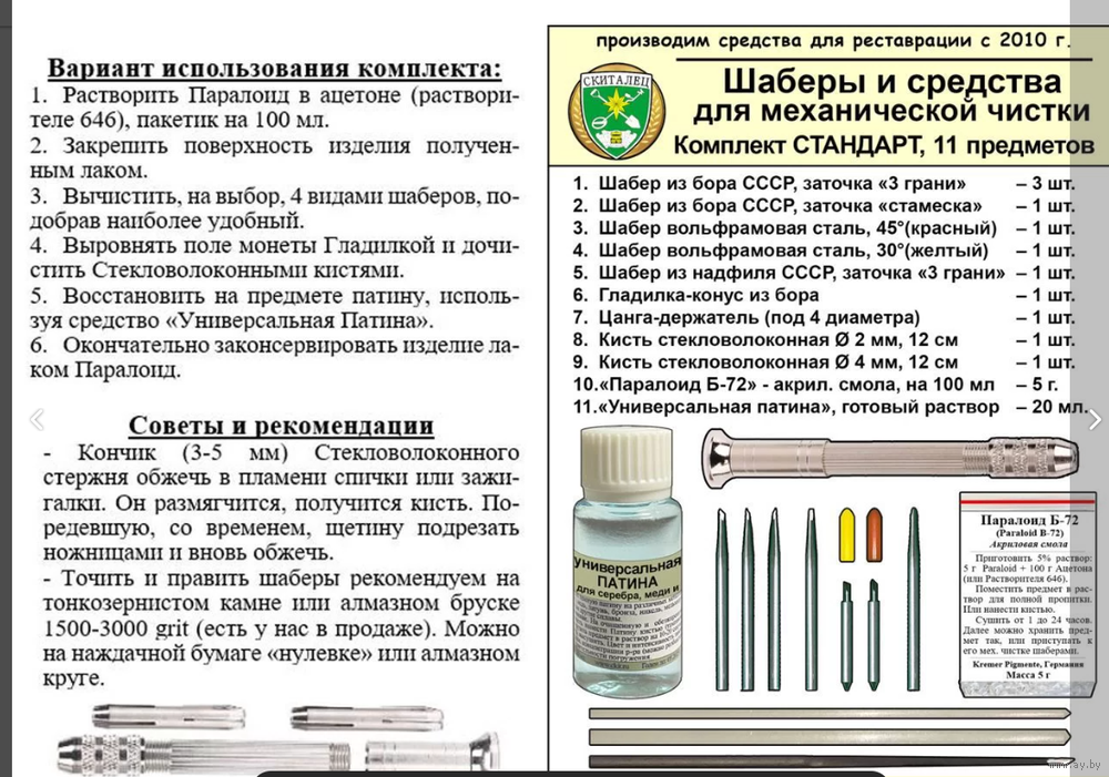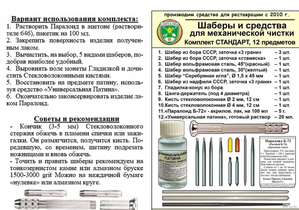 Набор состоит из шаберов различной формы, цанги - держателя, кистей стекловолоконных, химиии для реставрации изделий