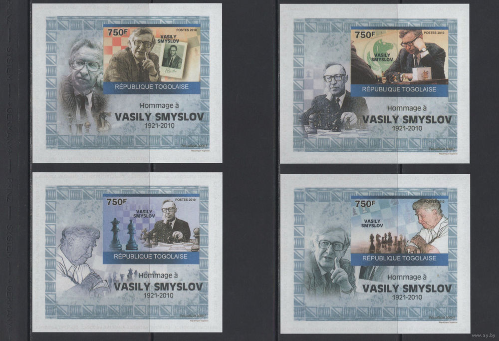 Шахматы Того 2010** 4 блока без зуб. Легенды. Советский и российский шахматист, гроссмейстер, 7-й чемпион мира Василий Смыслов