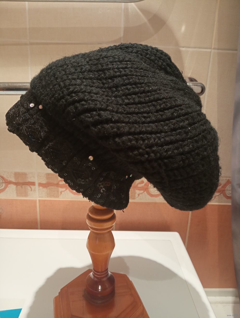 Фото 1. Берет с козырьком - теплый, черный с серебряной ниткой. 80% шерсти, 20% акрила. 15 рублей.