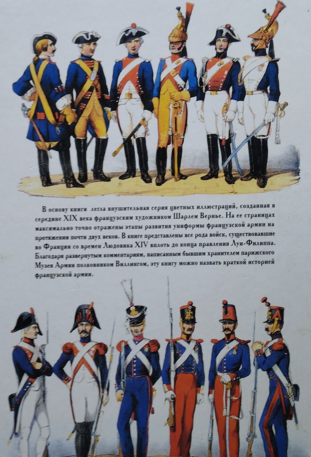 Большой энциклопедический формат. Мелованный альбом. Ляссе. Тираж 4000 экз. 128 стр. В основу книги легла внушительная серия цветных иллюстраций, созданная в середине XIX века французским художником Шарлем Вернье. На ее страницах максимально точно отражены этапы развития униформы французской армии на протяжении почти двух веков. В книге представлены все рода войск, существовавшие во Франции со времен Людовика XIV вплоть до конца правления Луи-Филиппа. Благодаря развернутым комментариям, написанным бывшим хранителем парижского Музея Армии полковником Виллингом, эту книгу можно назвать краткой историей французской армии.