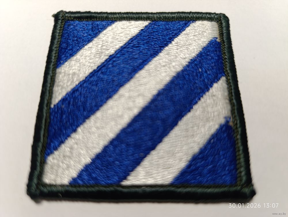 Оригинальный вышитый шеврон 3-й пехотной дивизии Армии США (Rock of the Marne) . Три белые диагональные полосы на синем фоне символизируют три крупные операции. Дивизия сформирована 12 ноября 1917 года, участвовала в обеих мировых войнах, Корейской войне, войне во Вьетнаме и конфликтах на Ближнем Востоке. В 2003 году первой вошла в г. Багдад.