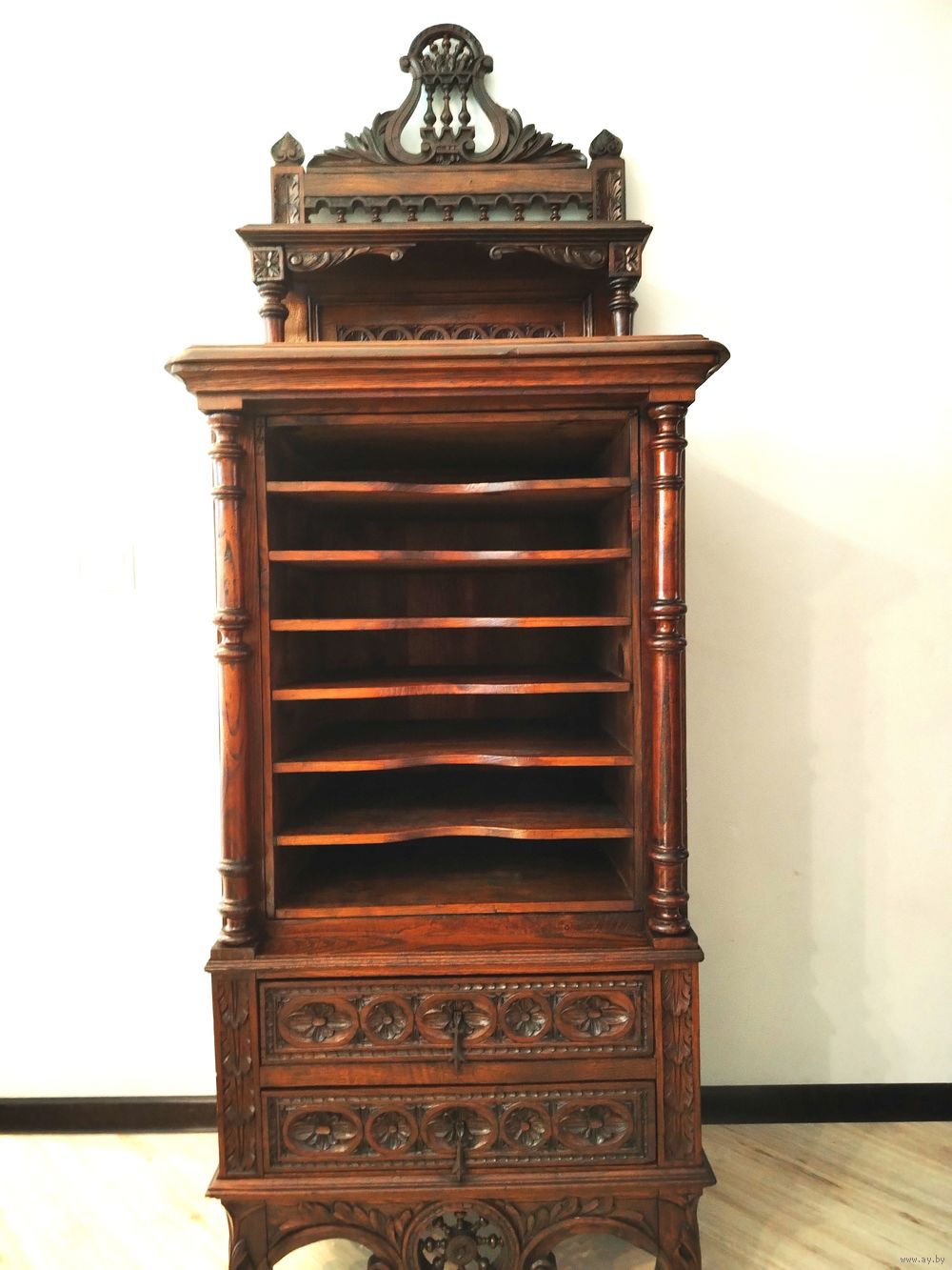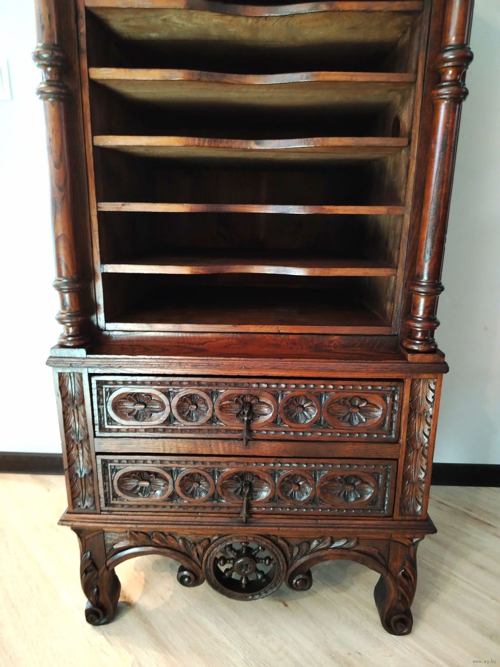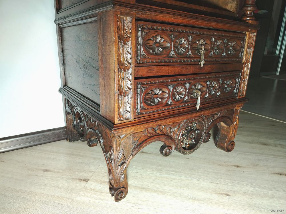 Прекрасный предмет мебели прошлых лет. Шкаф для документов (семидневка).Массив дерева (дуб) с красивой резьбой ручной работы. Высота до столешницы 118 см, полная высота 180 см, ширина 62см, глубина 50 см.