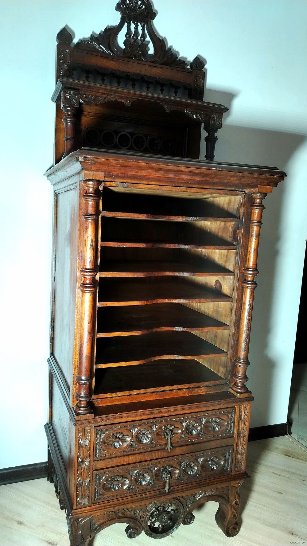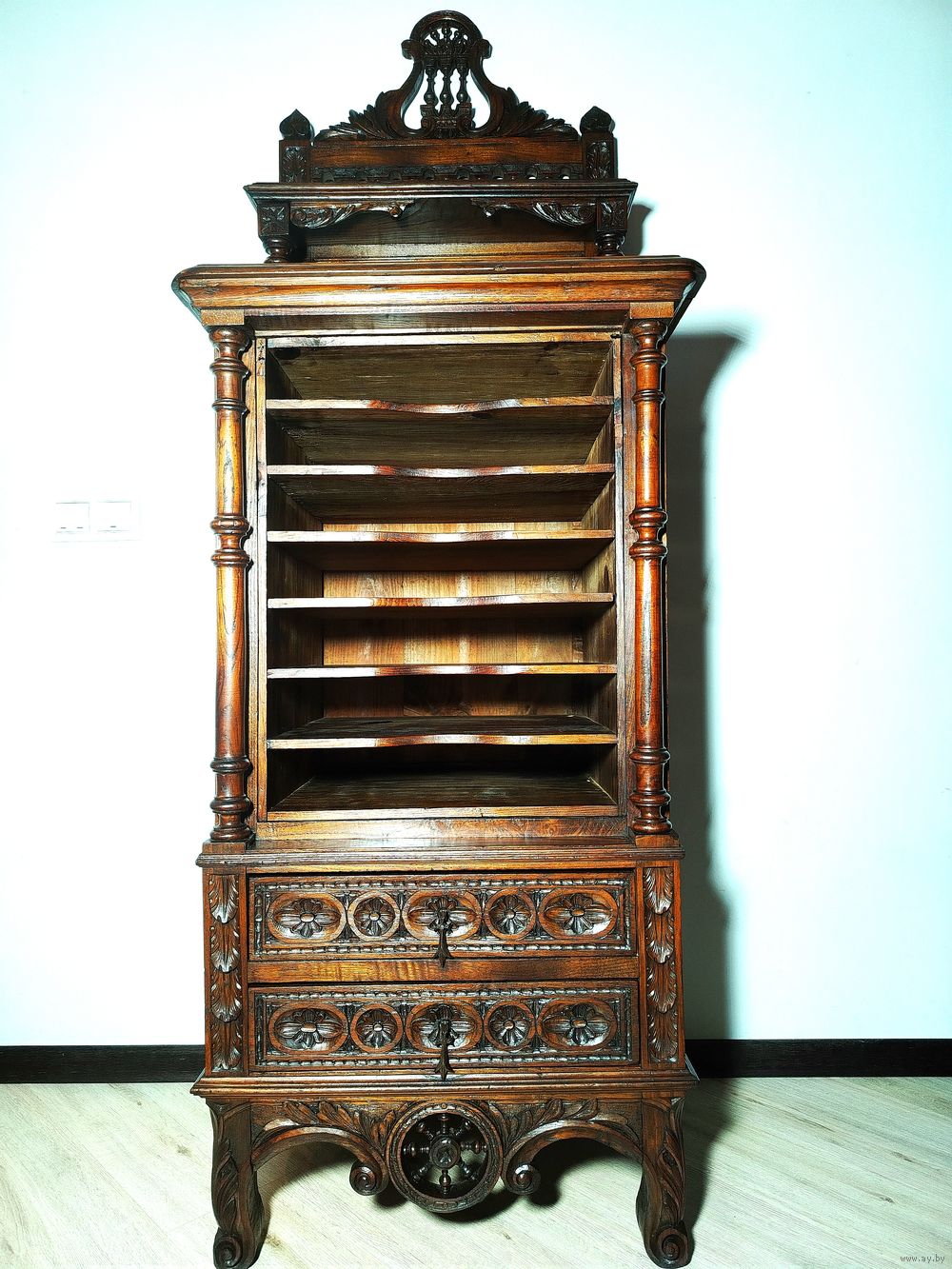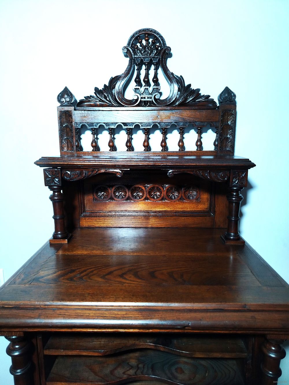 Прекрасный предмет мебели прошлых лет. Шкаф для документов (семидневка).Массив дерева (дуб) с красивой резьбой ручной работы. Высота до столешницы 118 см, полная высота 180 см, ширина 62см, глубина 50 см.
