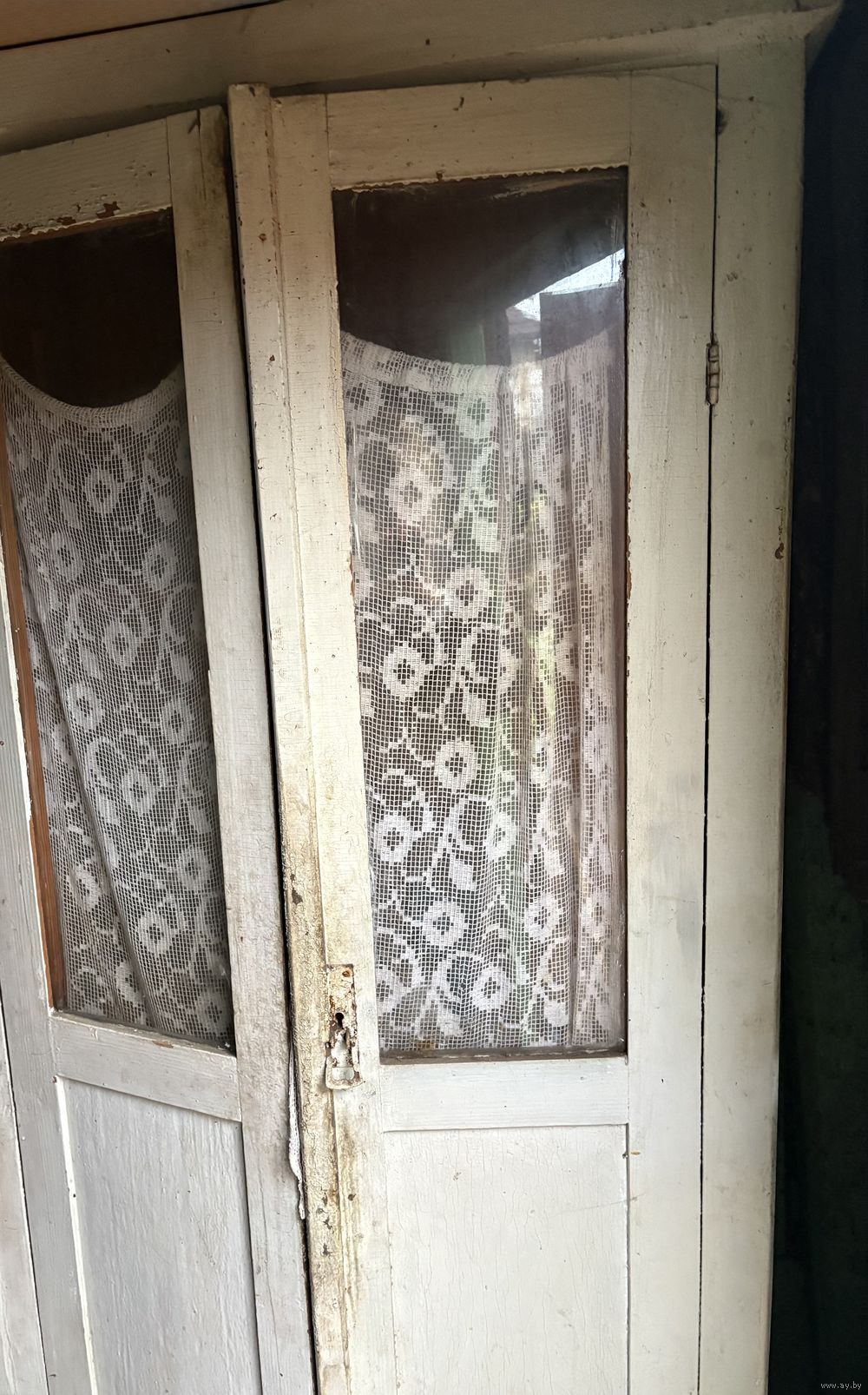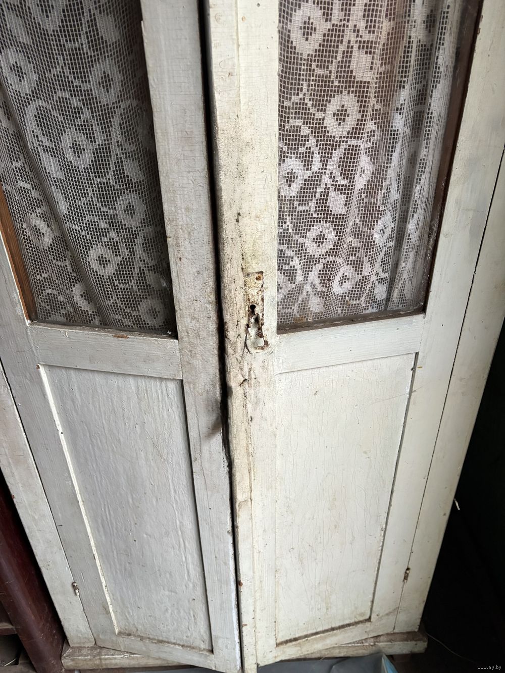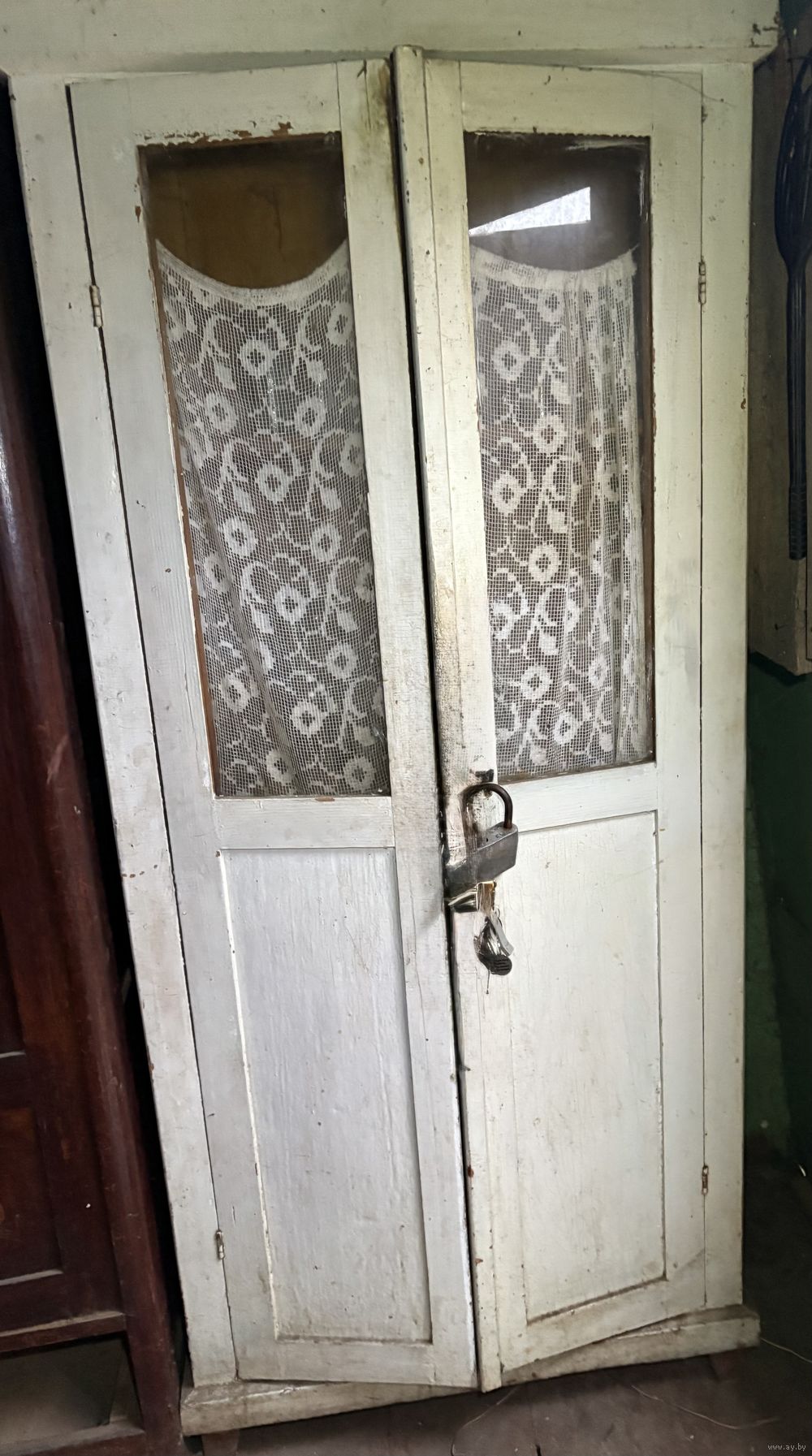 Шкаф деревянный для кухни со стеклом на дверках. Шкаф покрашен, поэтому требуется очистка для приведения в порядок.Боковые стороны и задняя стена- деревянные, дверцы фанерные.