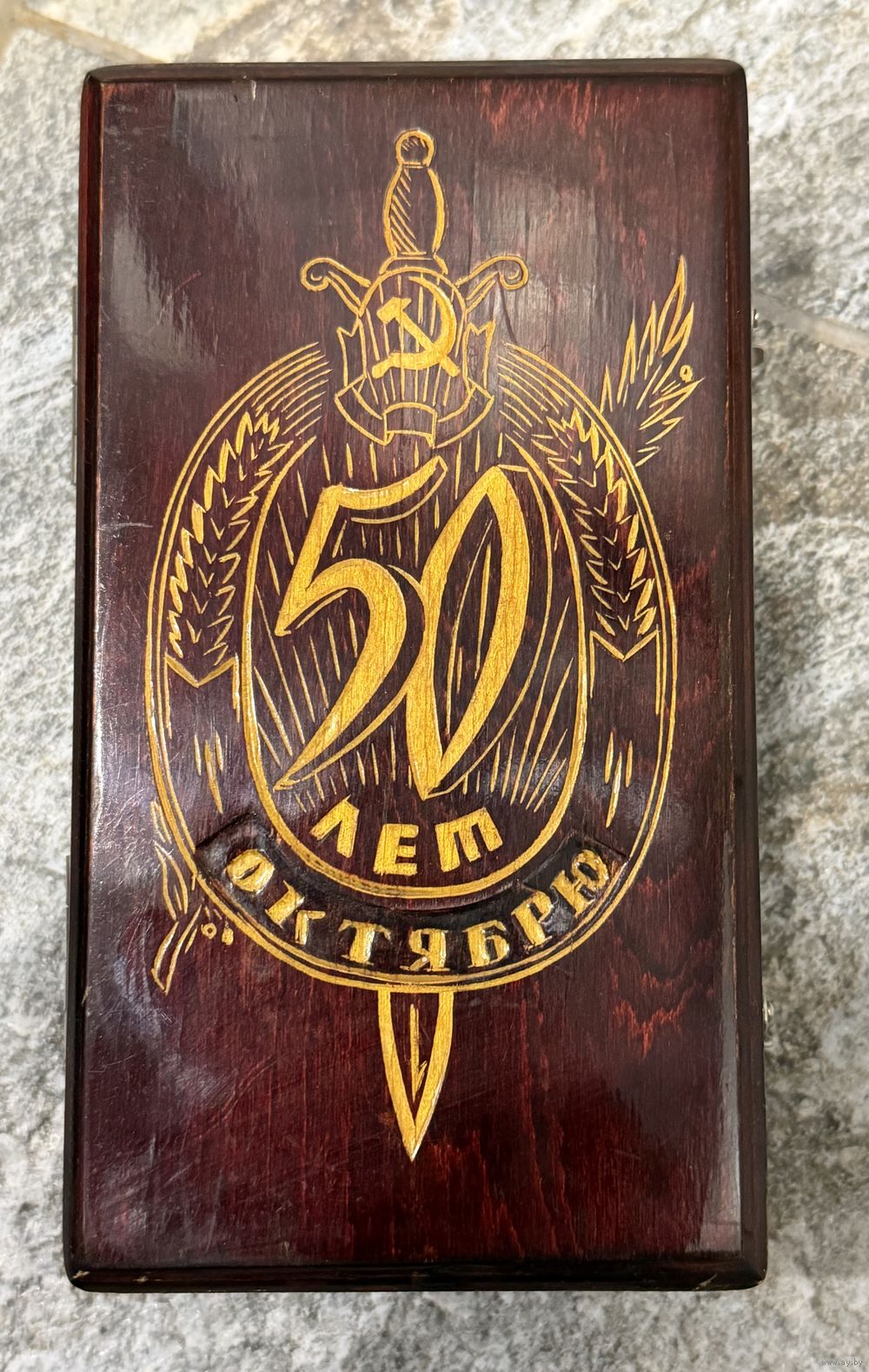 Шкатулка 50 лет Октября КГБ СССР 1967год размеры 10/17/7 см состояние отличное резьба.