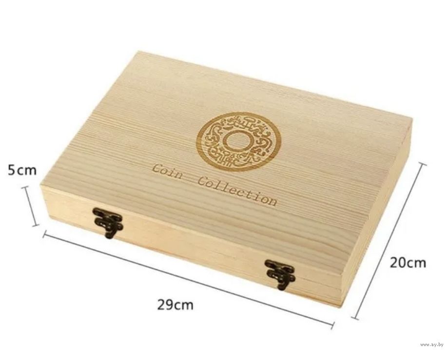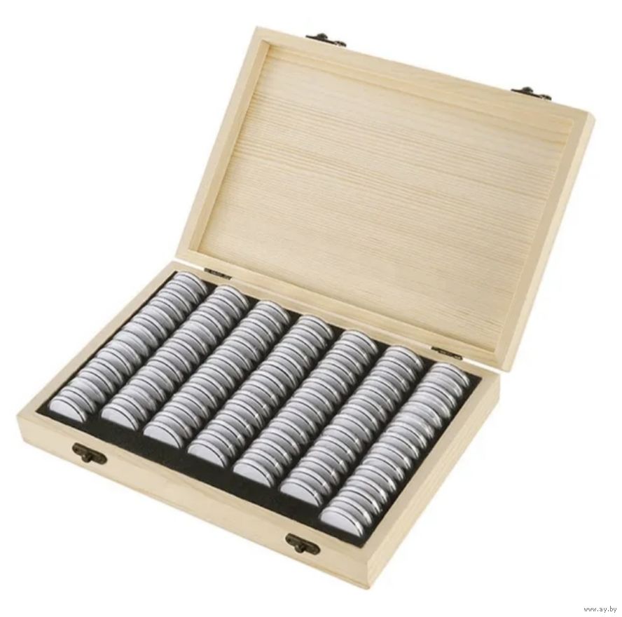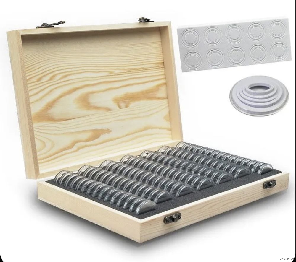 Шкатулка для хранения монет в капсулах. В комплекте 100 пластиковых капсул для монет ф-30 мм или меньше, 100 вкладышей для монет.