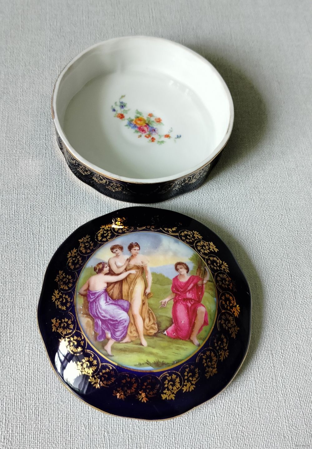 Изысканая шкатулка украшенная сценой "Суд Париса" в классическом стиле. Кобальт с золотой отделкой 22-каратным золотом. Состояние идеальное. Диаметр 11,5 см, высота 5 см.