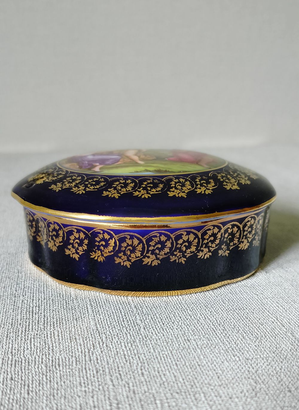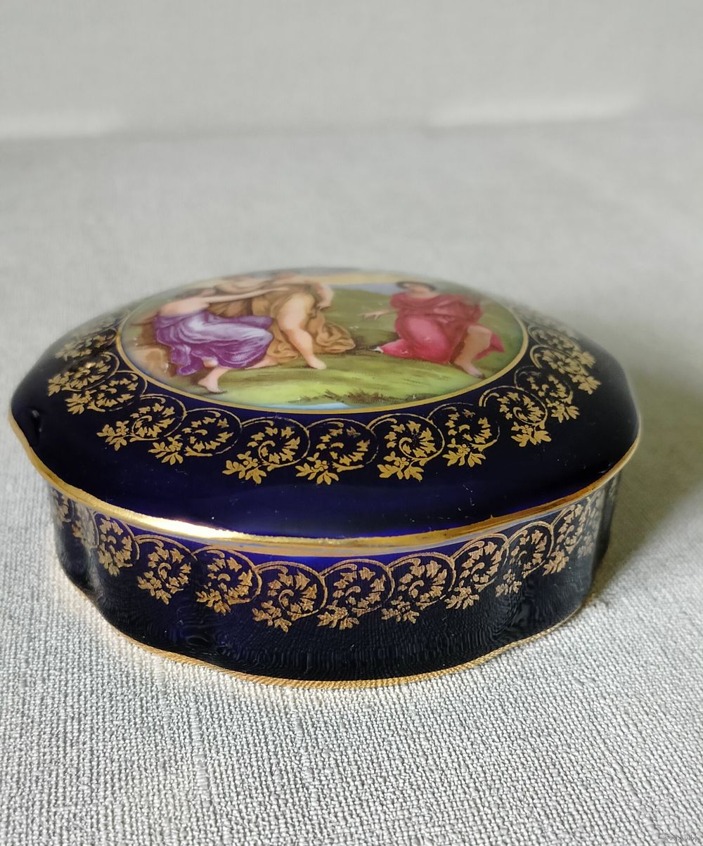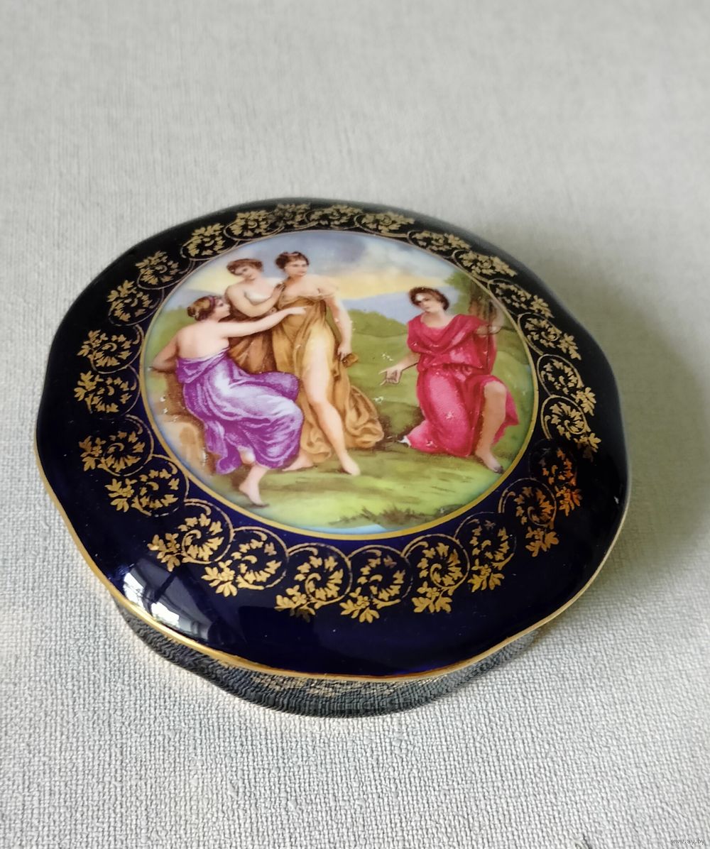 Изысканная шкатулка украшенная сценой "Суд Париса" в классическом стиле. На крышке шкатулки сюжет из греческой мифологии - Парис, троянский царевич, должен был решить какая из трех богинь прекраснее - Гера, Афина или Афродита. Кобальт, с золотой отделкой 22-каратным золотом. Состояние идеальное. Диаметр 11,5 см, высота 5 см.