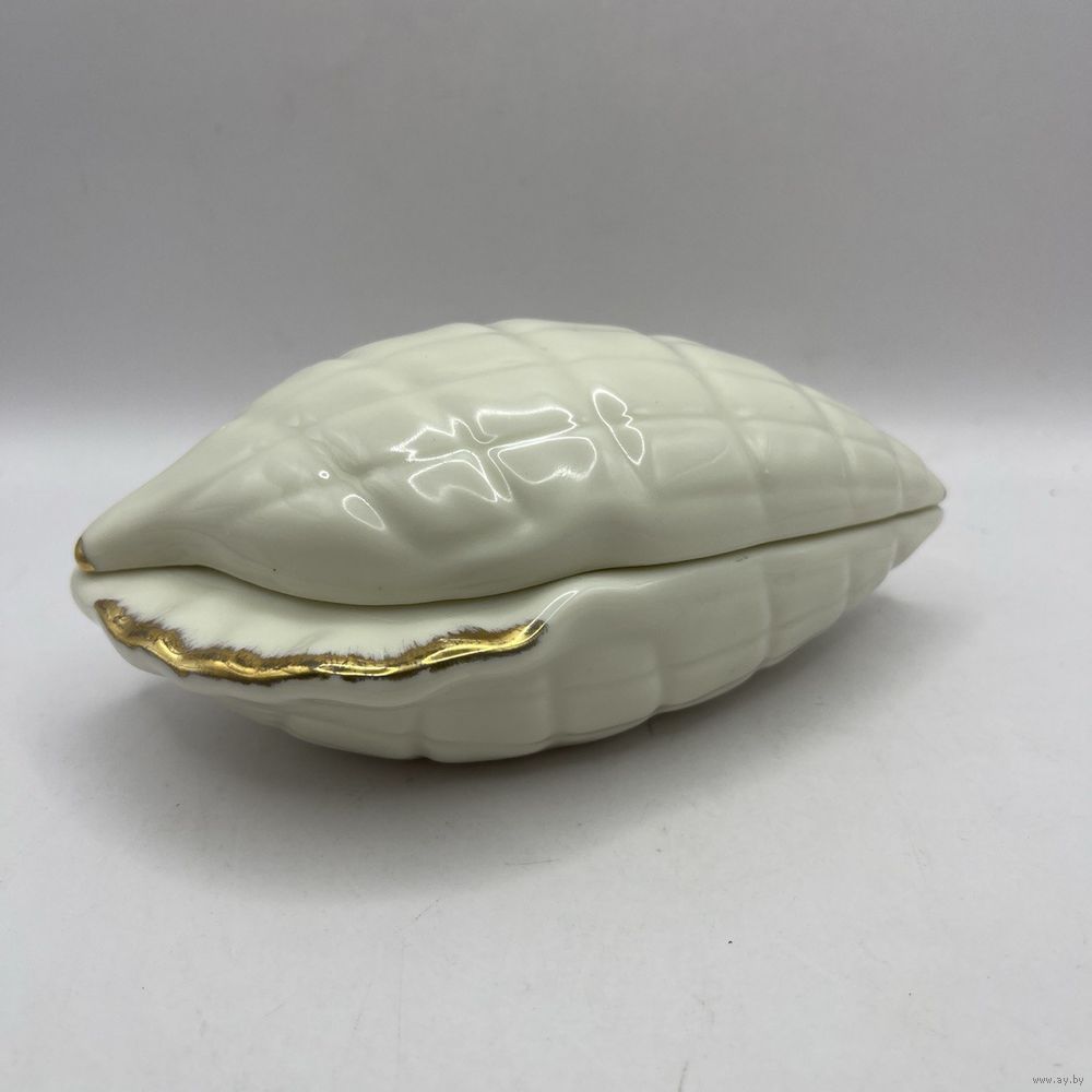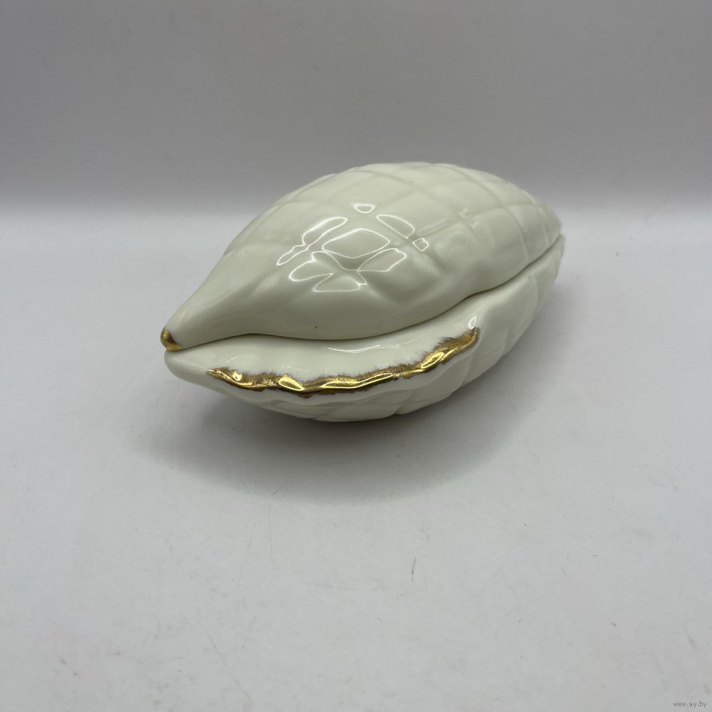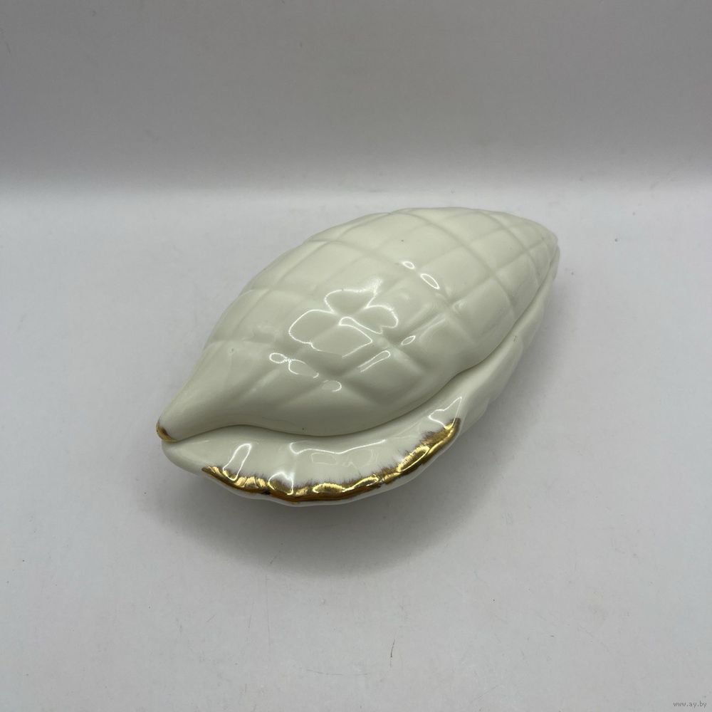 Винтажная шкатулка из глазурованного фарфора цвета айвори в форме ракушки. Ручная работа с декором золотом. Франция. 1950-е г.г. Размер 15 х 8 х 6,5 см. Глубина 3 см.