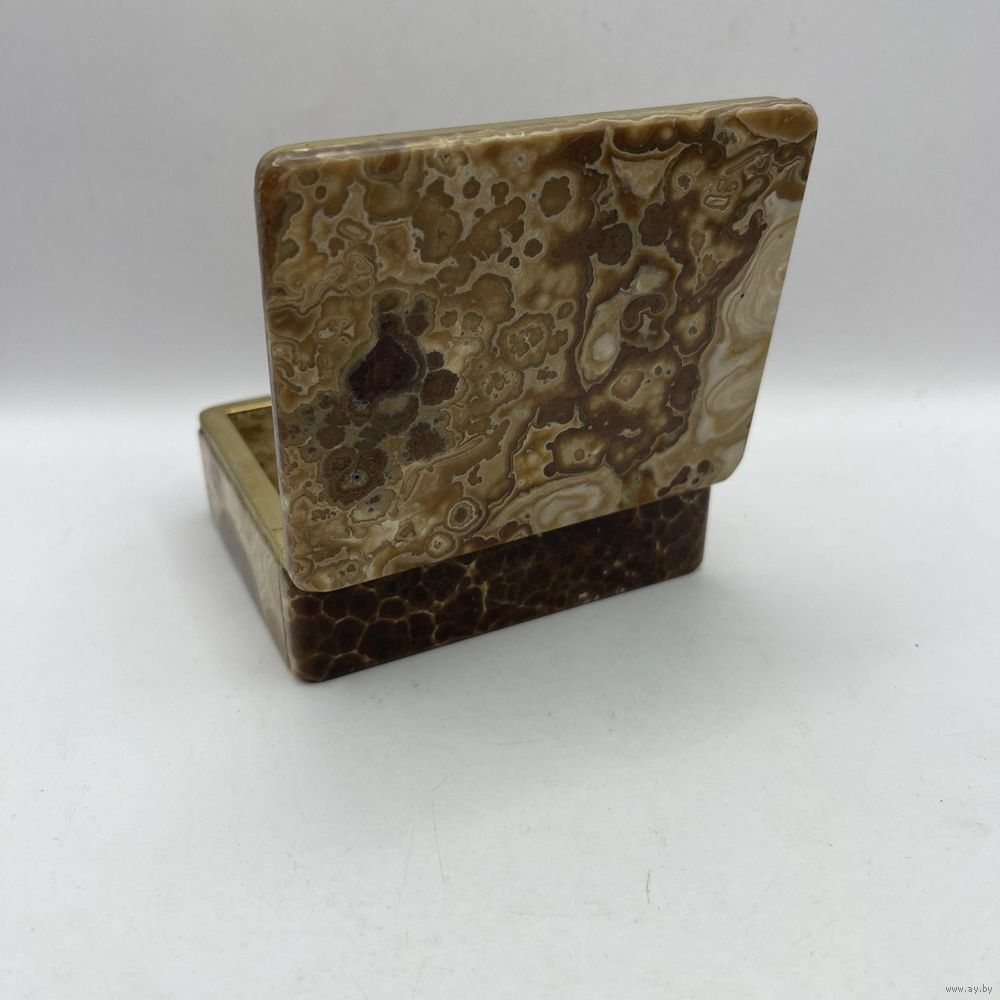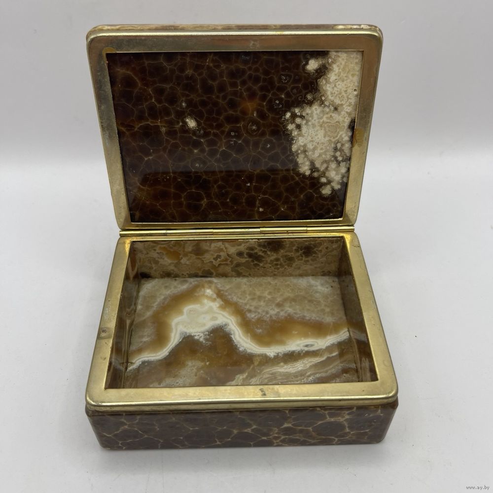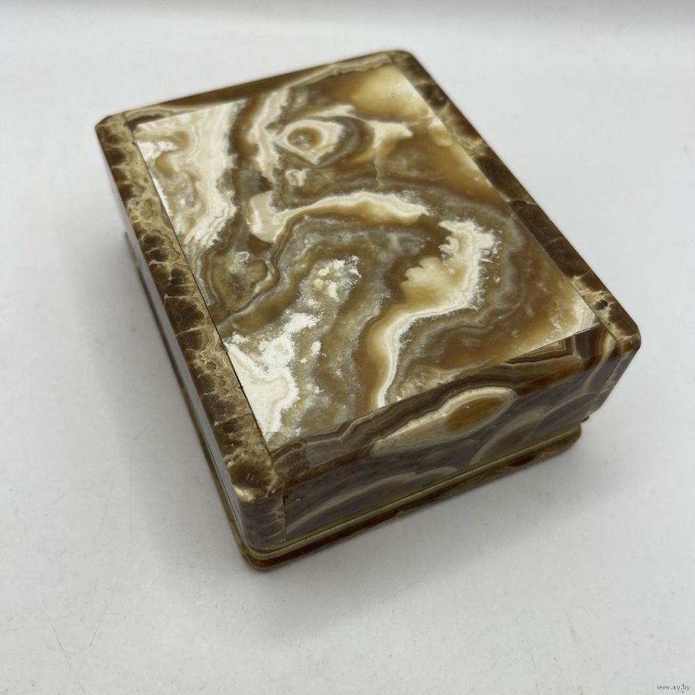 Антикварная шкатулка из натурального оникса ручной работы с откидной крышкой и латунными элементами. Италия. 1950-е г.г. Размер 10 х 8 х 4 см. Глубина 2,5 см. Естественная патина на латунных элементах. Скол на уголке снизу, на внешний вид не влияет (см. фото, учтено в цене).