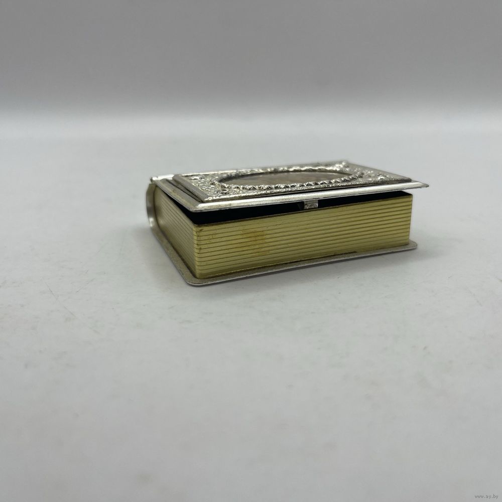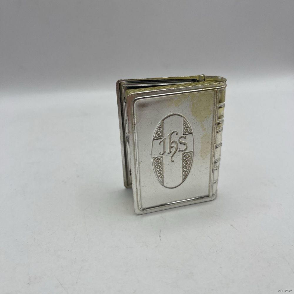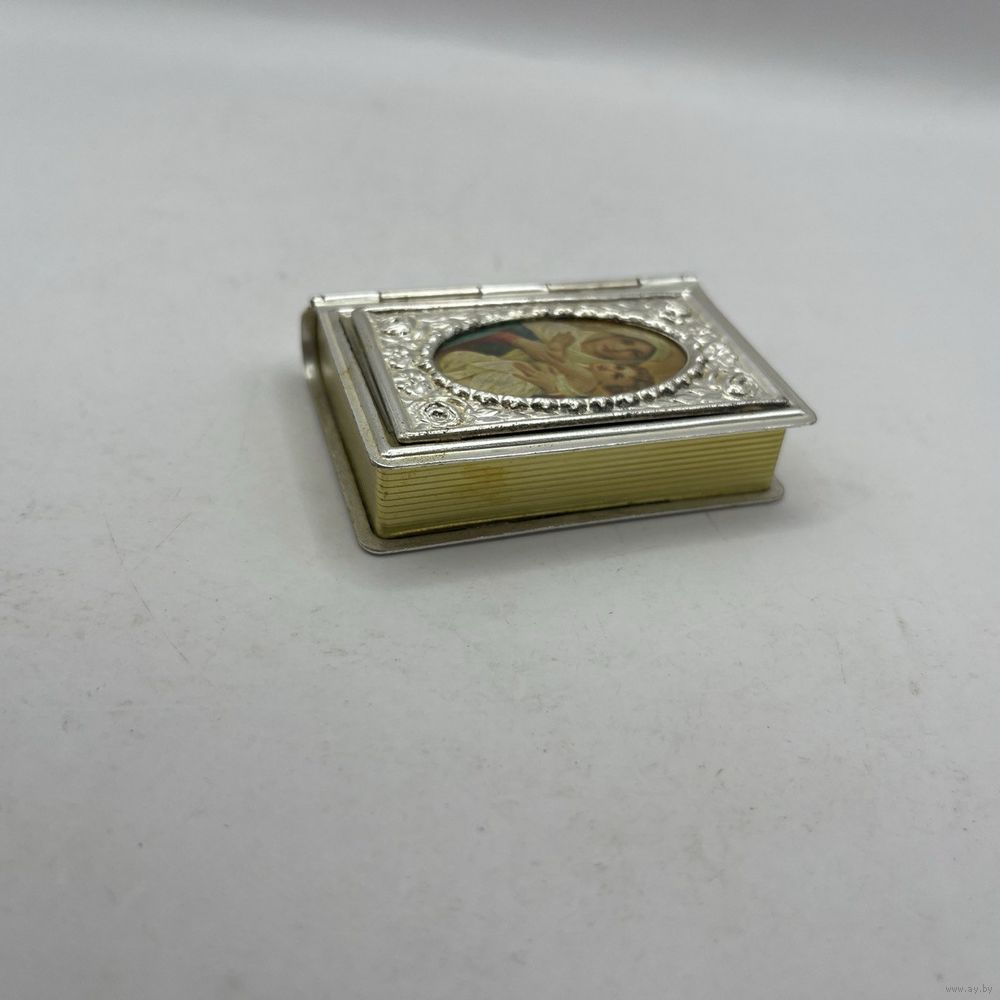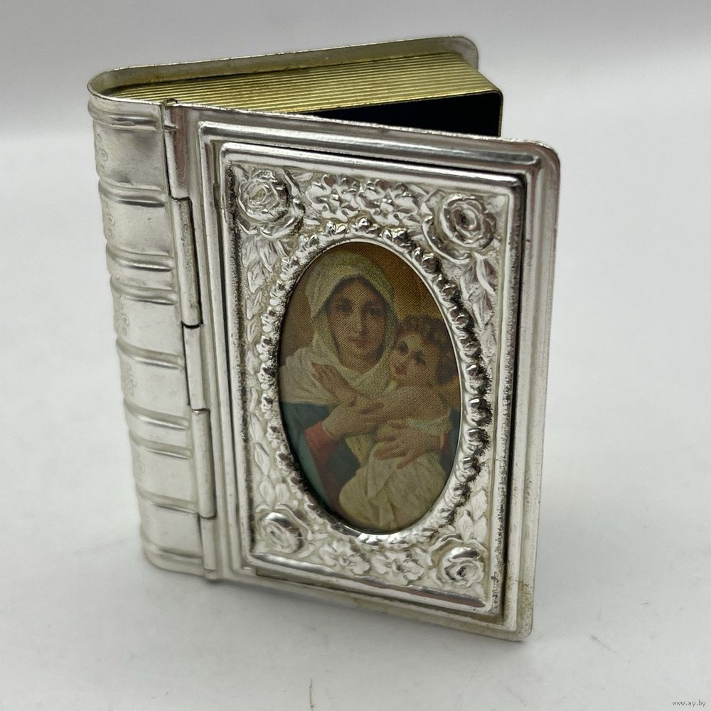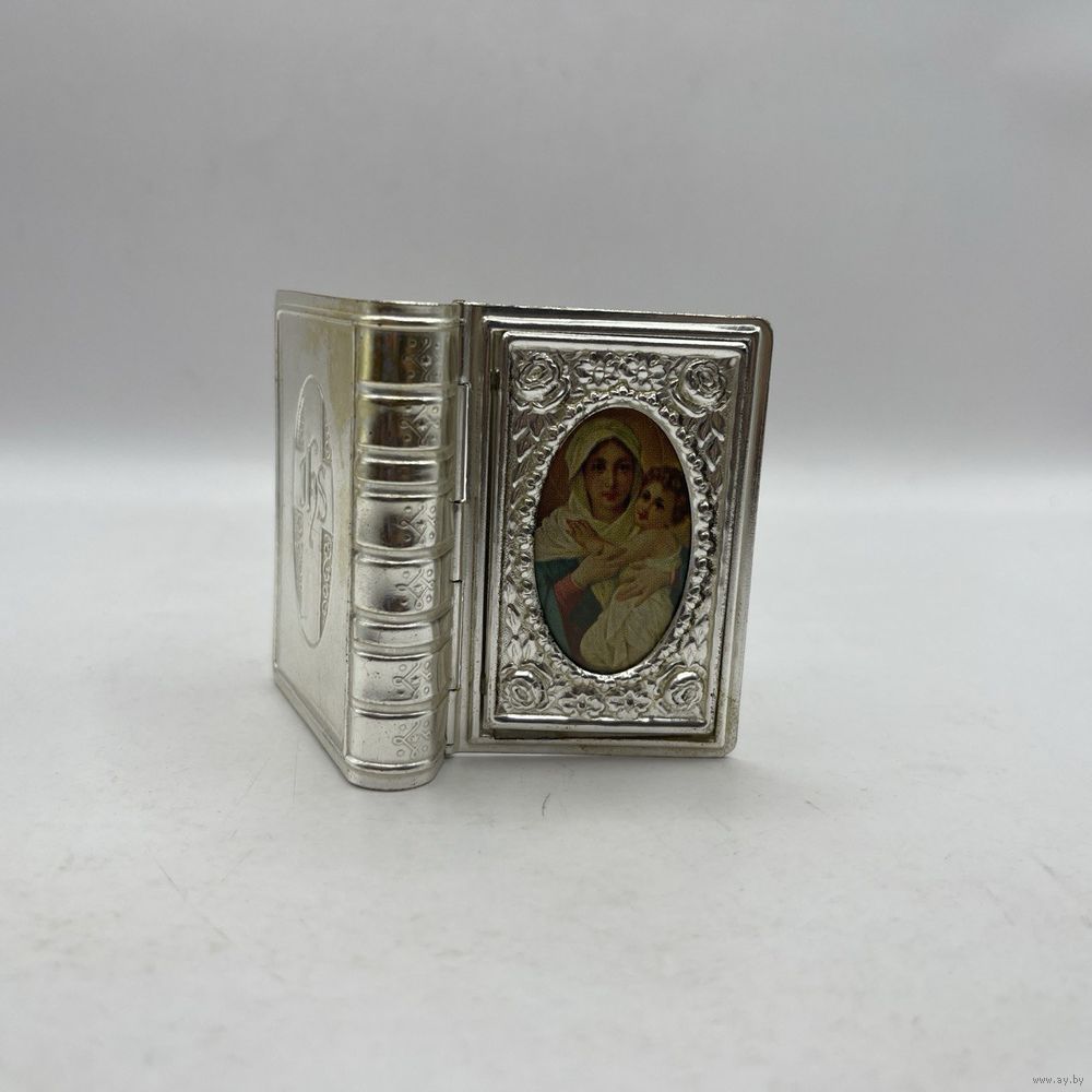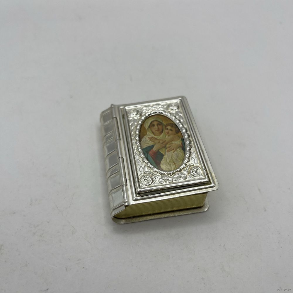 Антикварная миниатюрная шкатулка ручной работы из посеребренного металла. Имитирует переплет книги с образом Девы Марии с Младенцем, обрамленном рельефными тиснеными розами. Используется для хранения религиозных предметов или как подарок на религиозные праздники. Франция. 1950-е г.г. Крышка плотно закрывается. Размер 5 х 6 х 1,5 см. Естественная патина.
