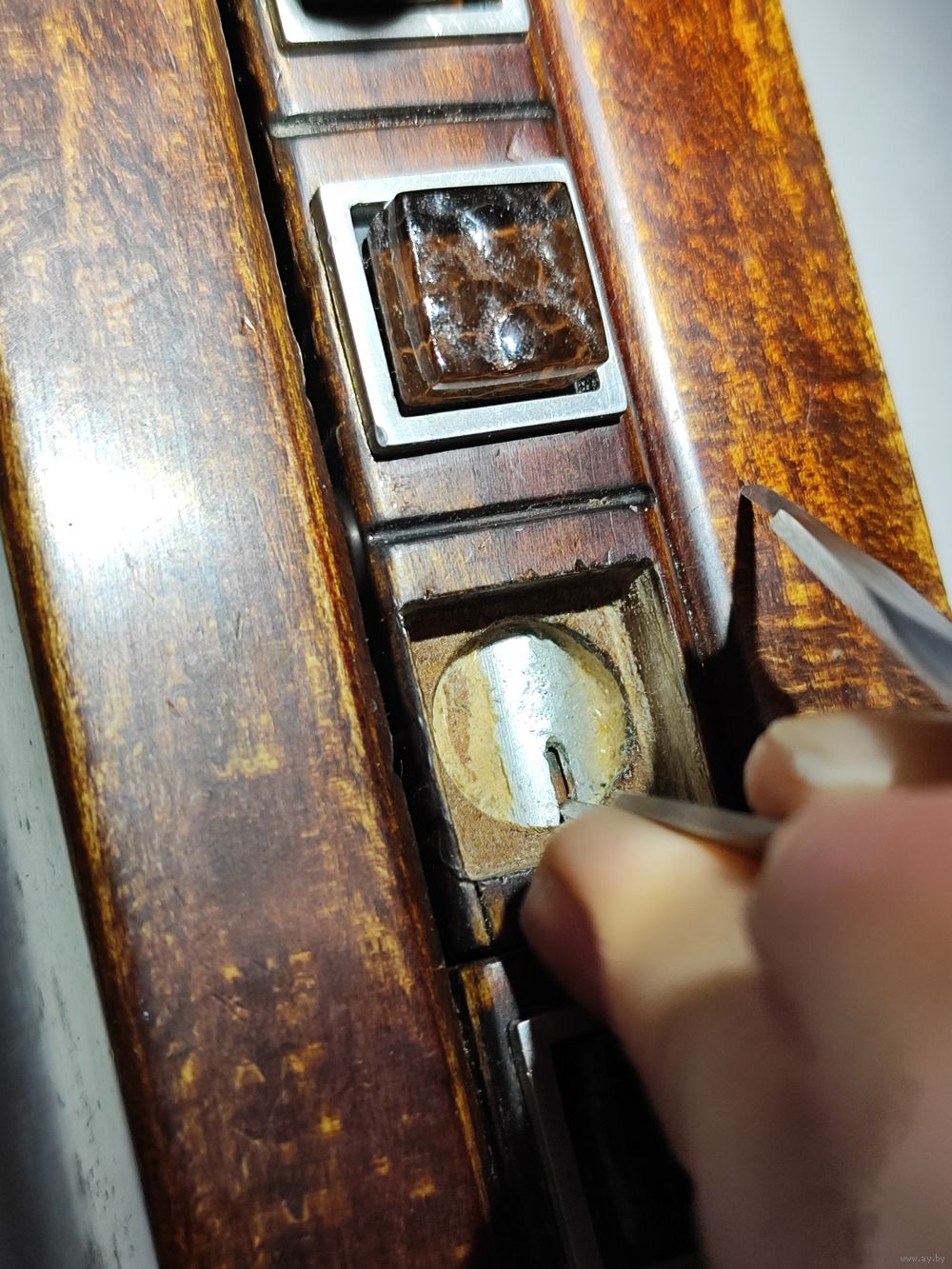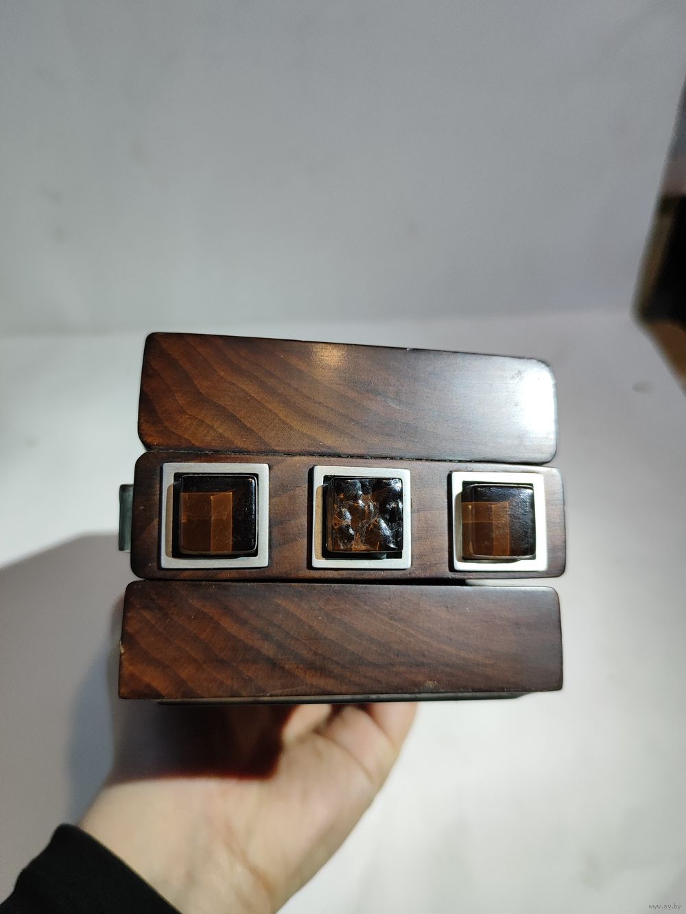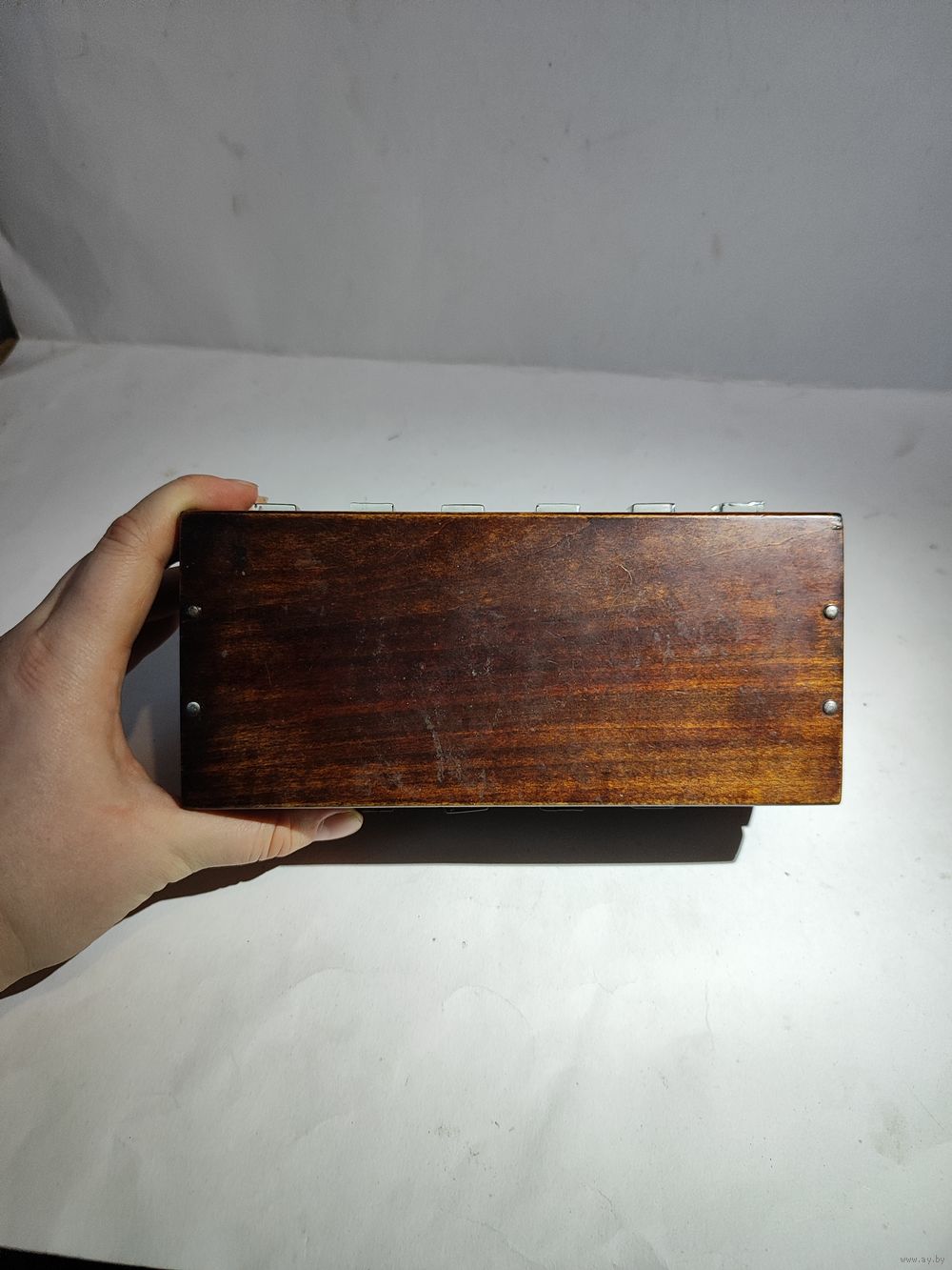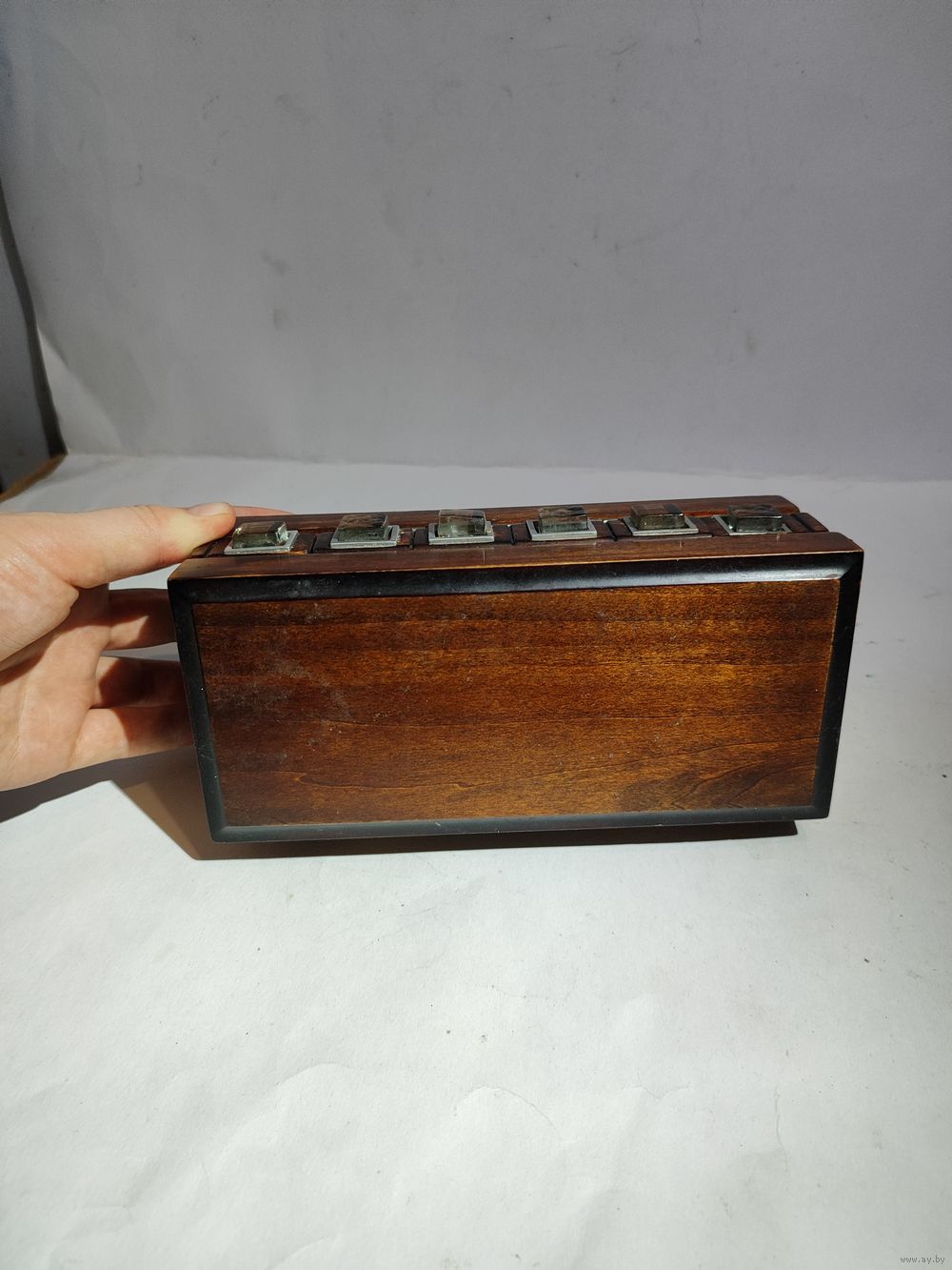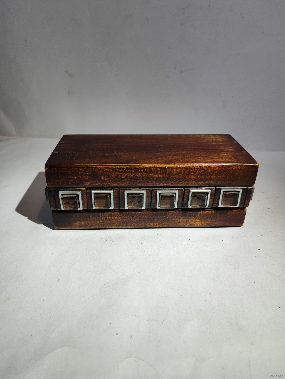 Обычно не открыть с двух сторон защёлки-замки. Открывается просто : вынимаются две кнопки из первого ряда(на фото),под ними мини защёлки,которые надо одновременно открыть(иголками или чем то подобным).Народное творчество времён СССР. Размеры 19,5 х 8,7 х 7 см. Состояние на фото(спереди ,внутри есть царапины-видимо пытались открыть).Нет одной кнопки.