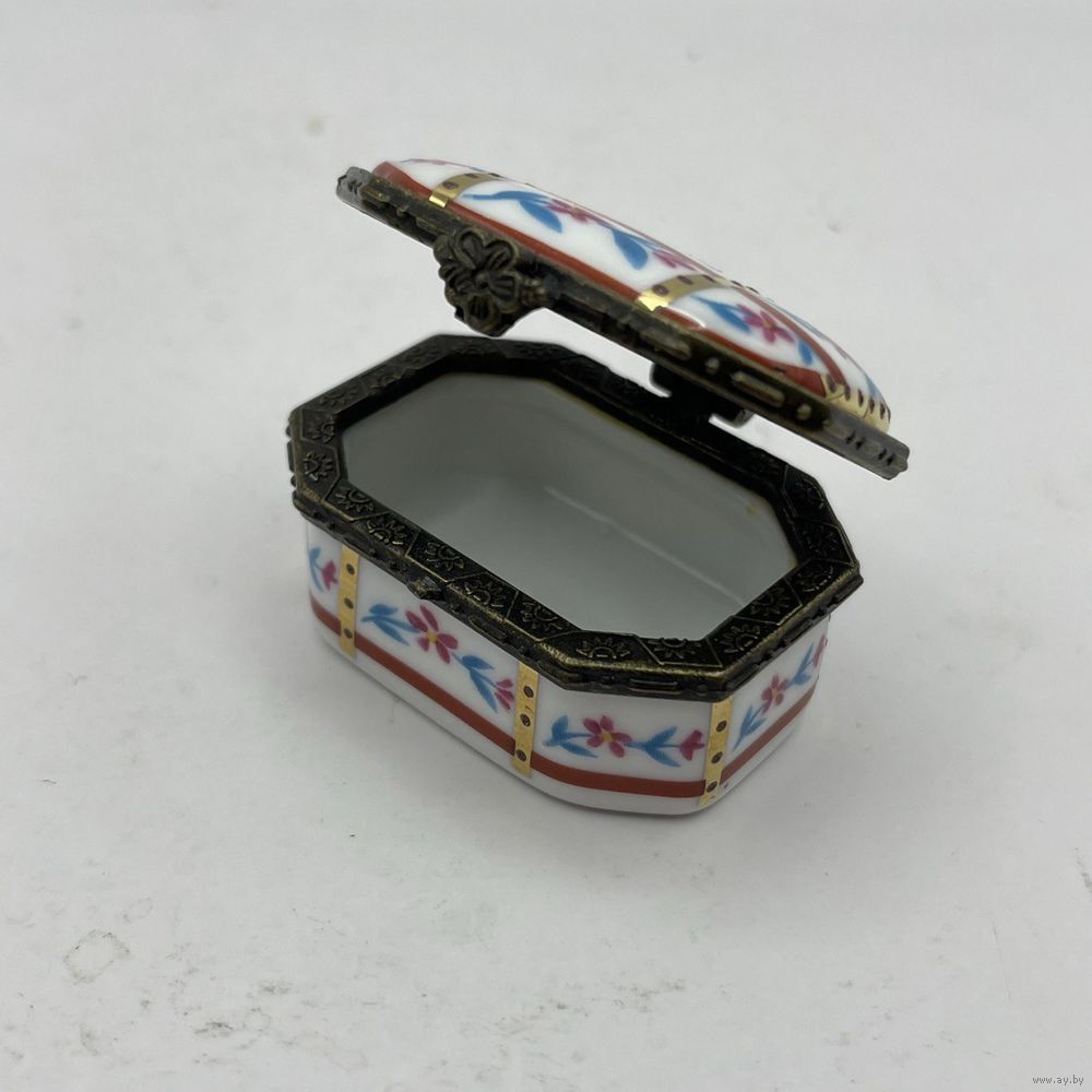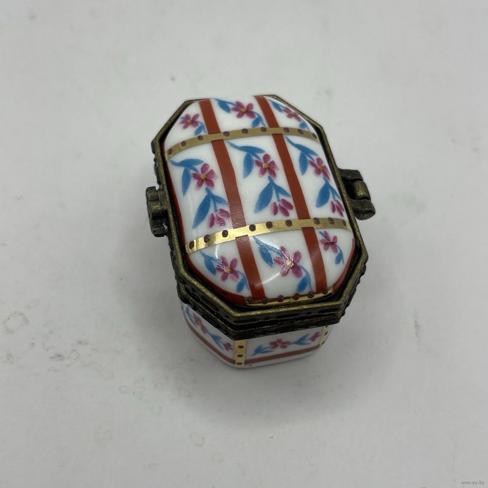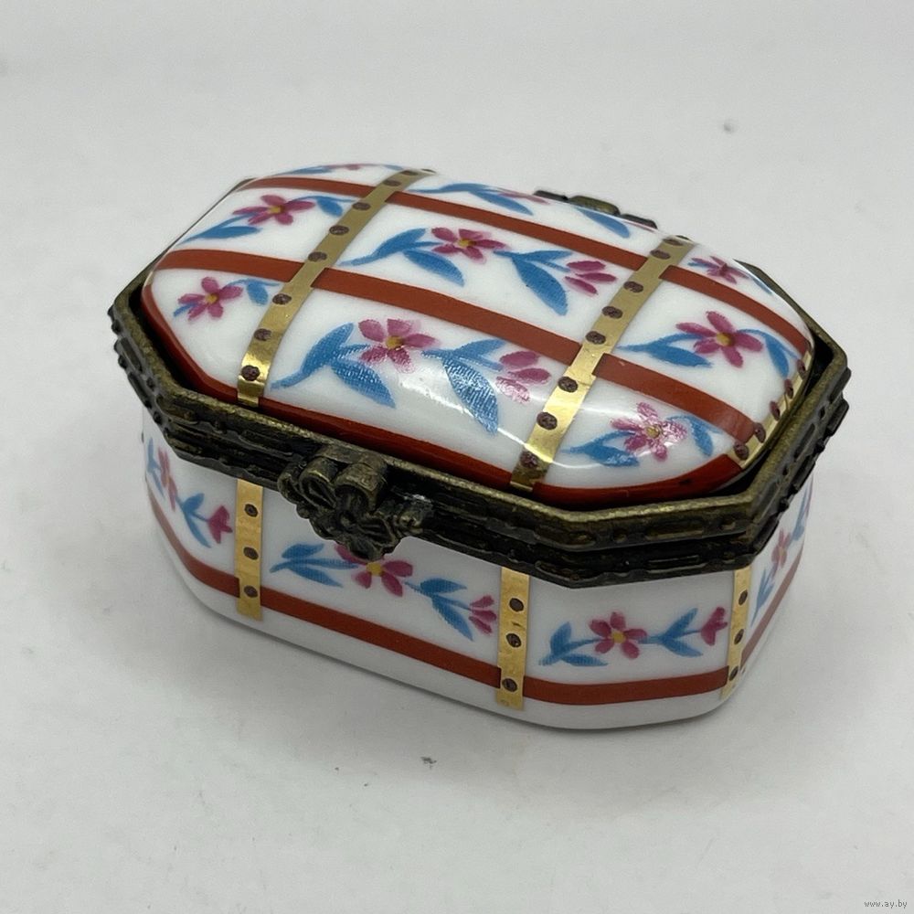 Винтажная фарфоровая шкатулка-таблетница, шкатулочка для колец с цветочным узором и ручным декором золотом. Замочек в виде цветка. Откидная крышка с латунными элементами плотно закрывается. Италия. Клеймо. Размер 5 х 4 см. Высота 3 см.