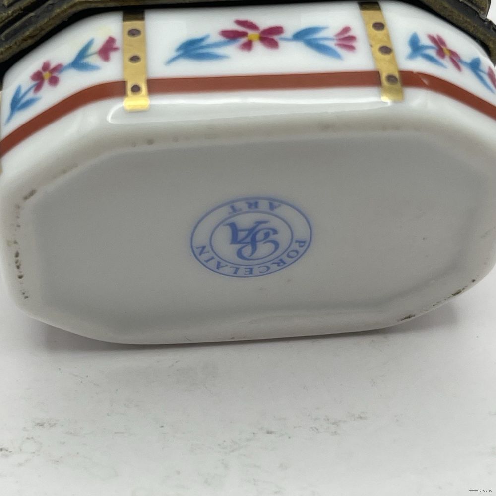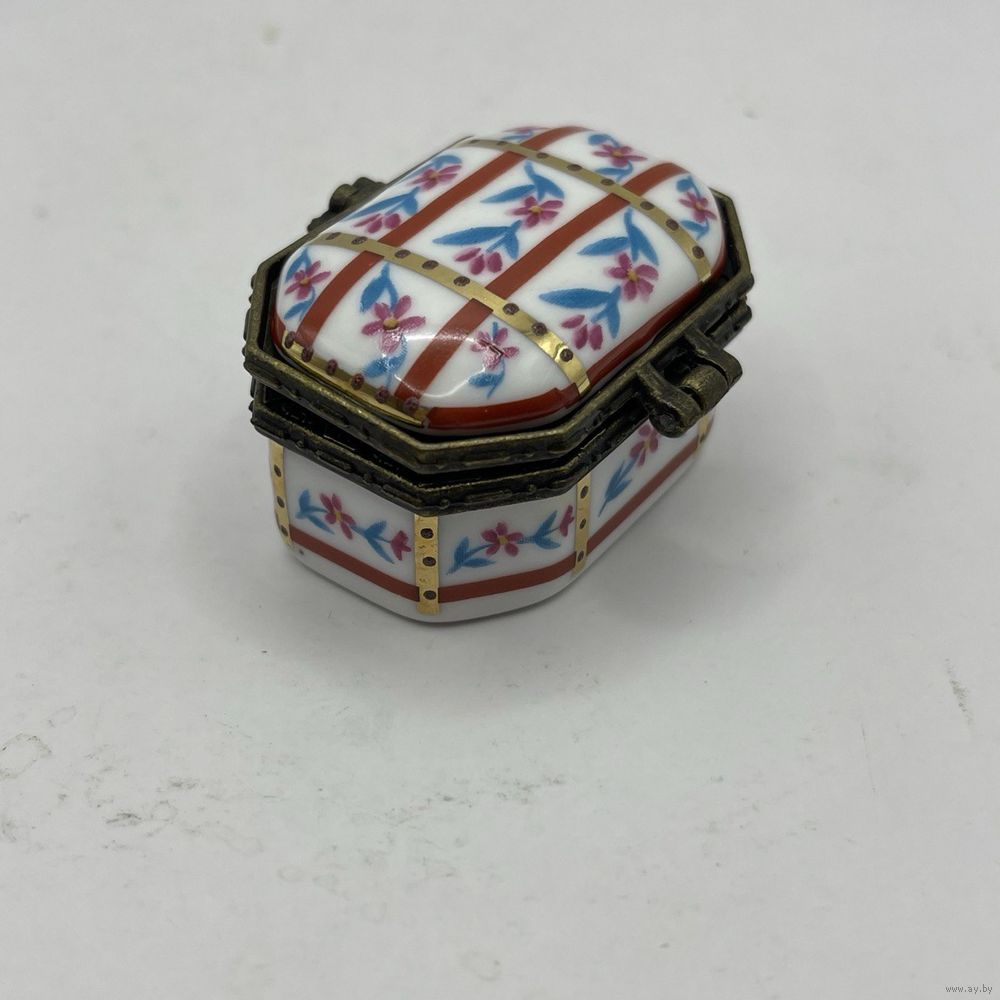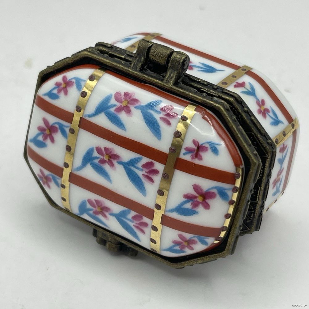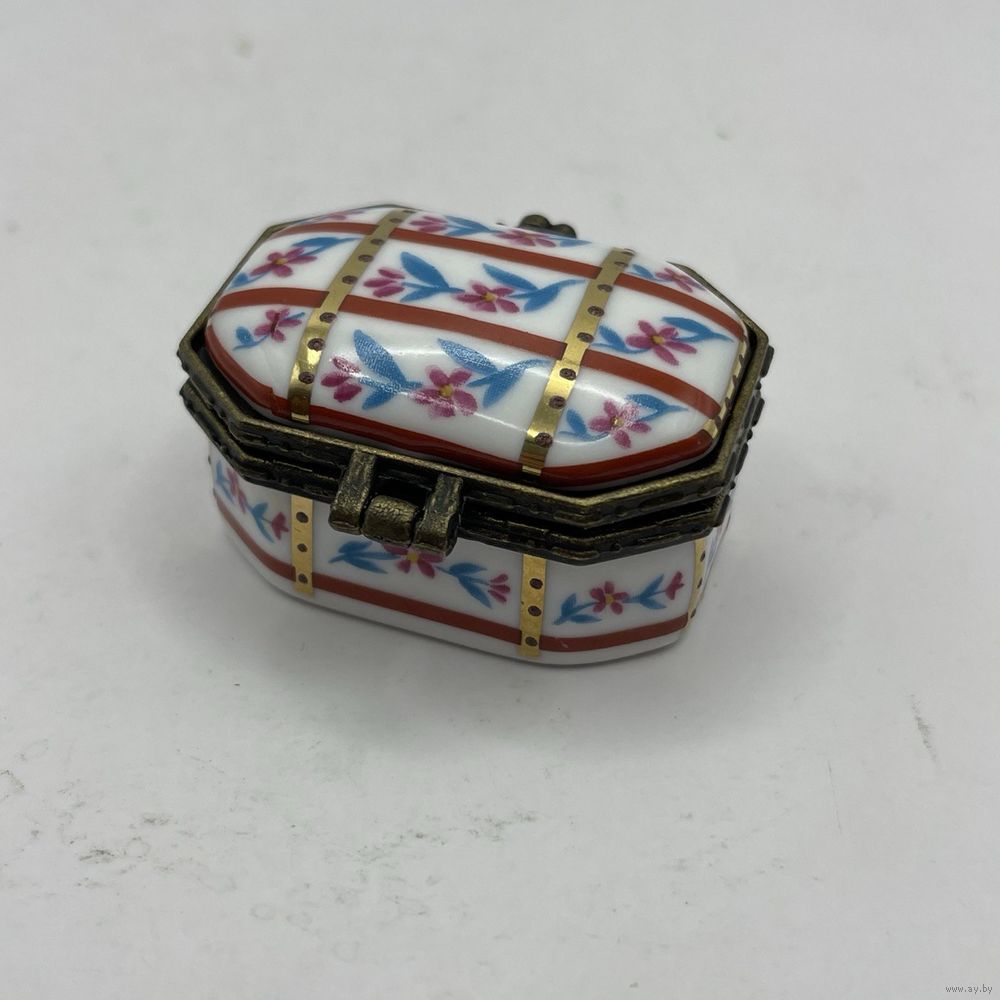 Винтажная фарфоровая шкатулка-таблетница, шкатулочка для колец с цветочным узором и ручным декором золотом. Замочек в виде цветка. Откидная крышка с латунными элементами плотно закрывается. Италия. Клеймо. Размер 5 х 4 см. Высота 3 см.