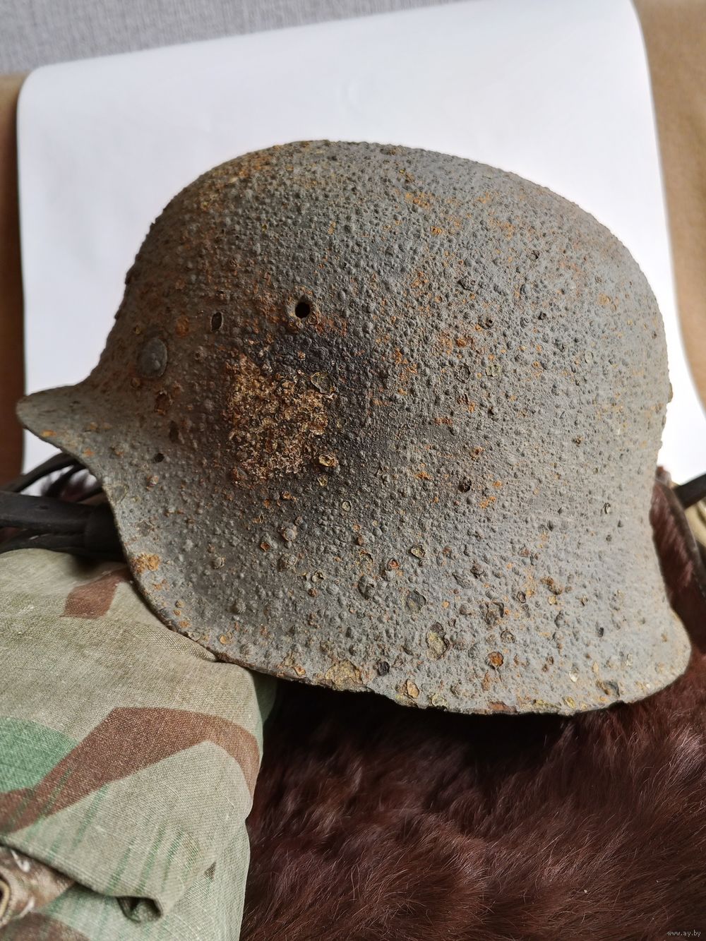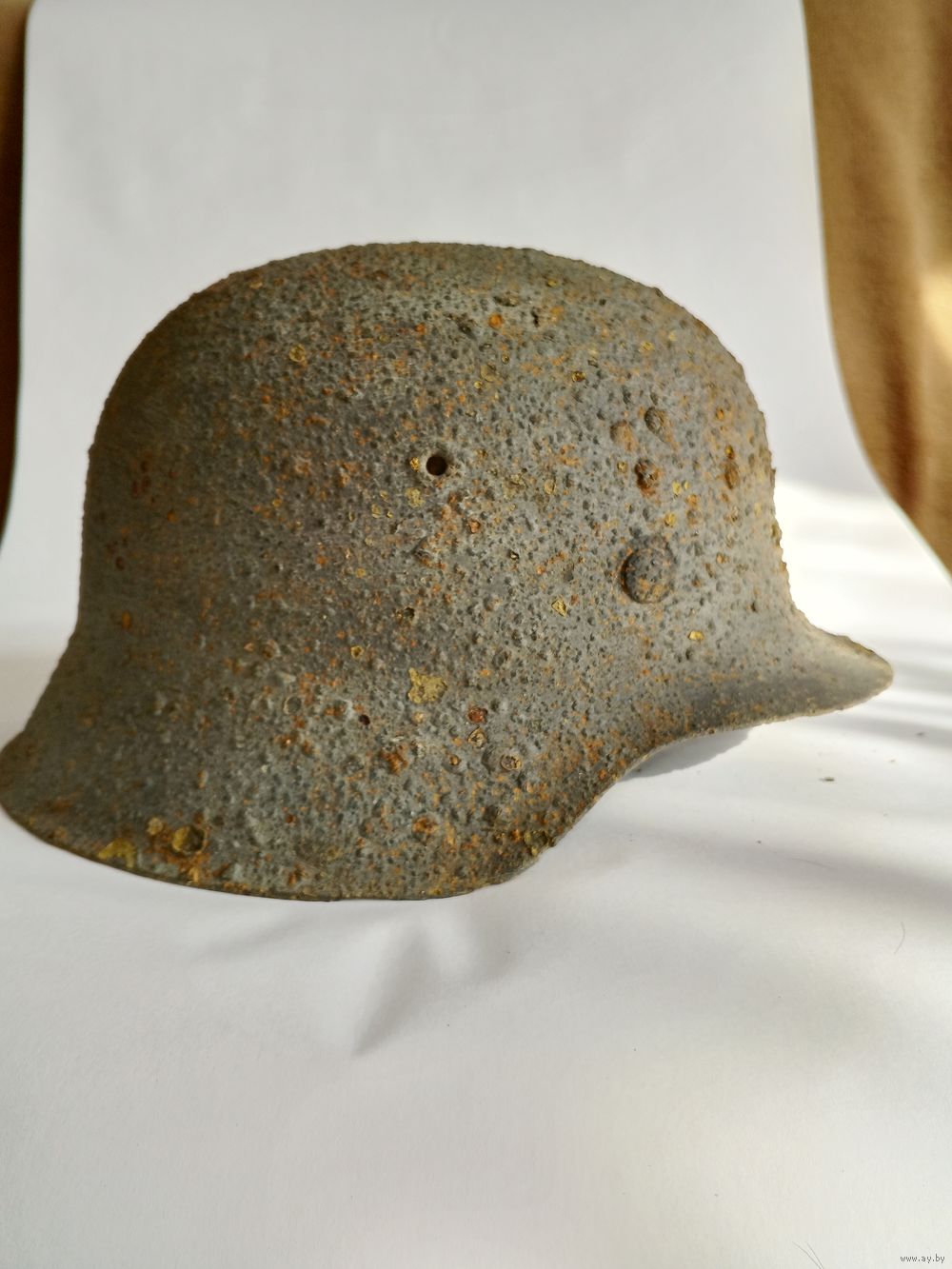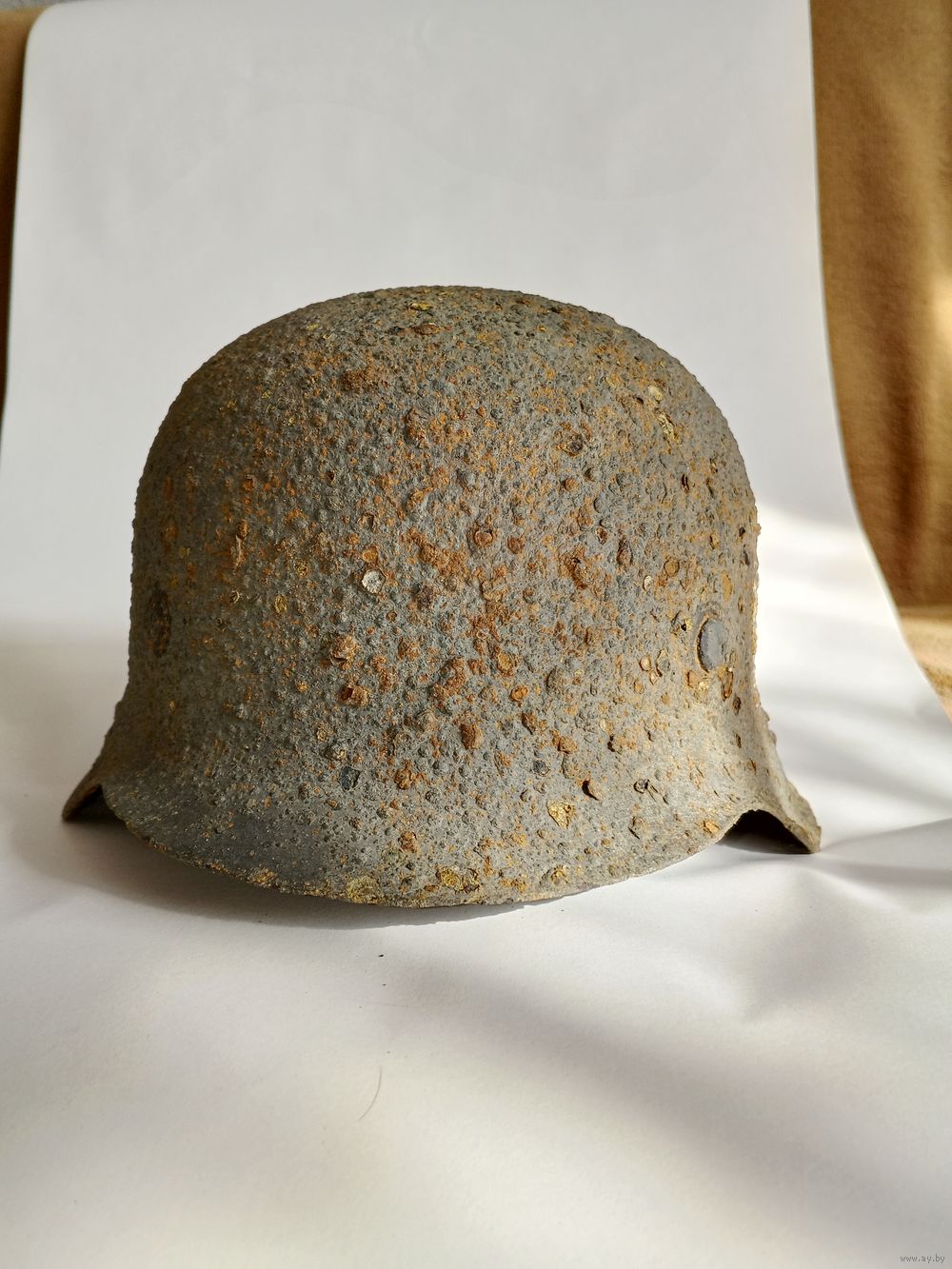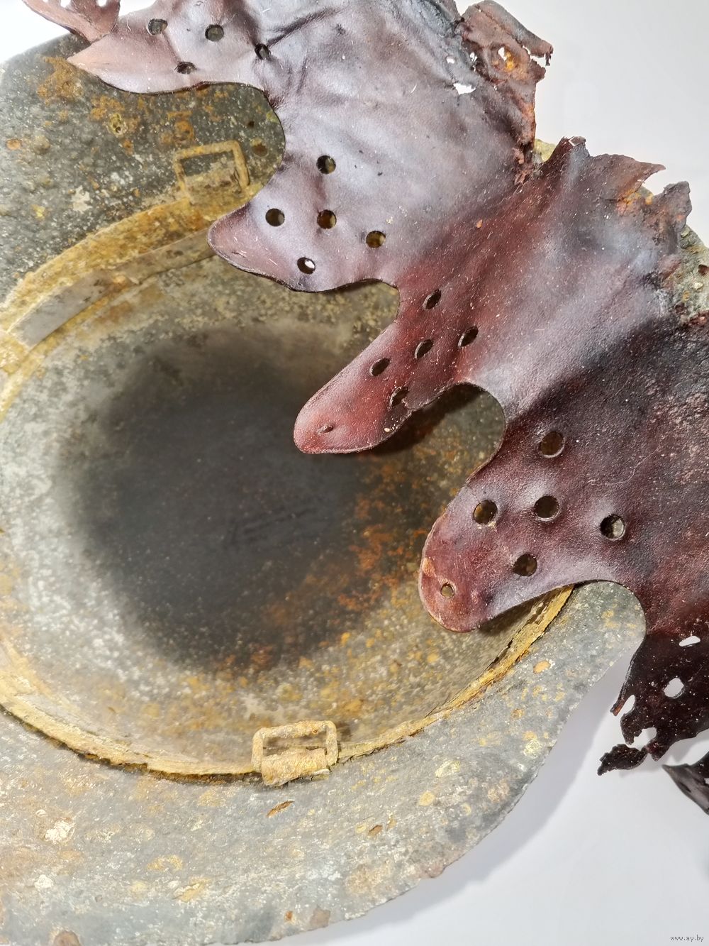 | Шлем тяжёлый несмотря на малый размер , штамп внутри сохранился , весь в краске , металл крепкий , найдена в "правильном" положении , помыта водой , кожа сохранилась , по окружности 63 , как есть | |
