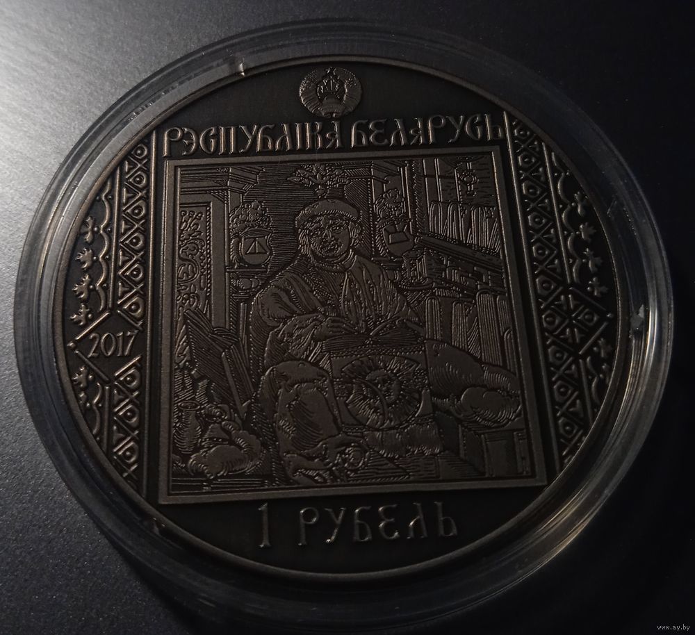 вверху – рельефное изображение Государственного герба Республики Беларусь, под ним надпись: РЭСПУБЛIКА БЕЛАРУСЬ; в центре – гравюра автопортрета Франциска Скорины из книги "Бытия", изданной Ф. Скориной; слева и справа – декоративный орнамент, в поле которого вписаны: слева – год чеканки, внизу в центре – номинал: 1 РУБЕЛЬ (на медно-никелевой).