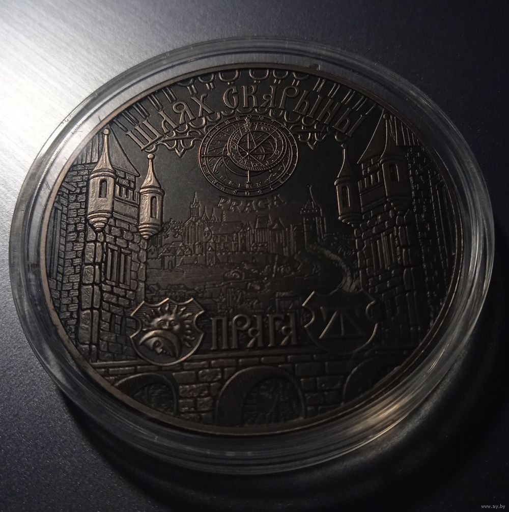 в центре – изображение города Прага со старинной гравюры ("Всемирная хроника" Шеделя, XV в.), слева и справа – фрагменты зданий из гравюр Ф. Скорины; в нижней части - надпись "ПРАГА"; в верхней части – изображение астрономических пражских часов, над ним – надпись по кругу "ШЛЯХ СКАРЫНЫ".