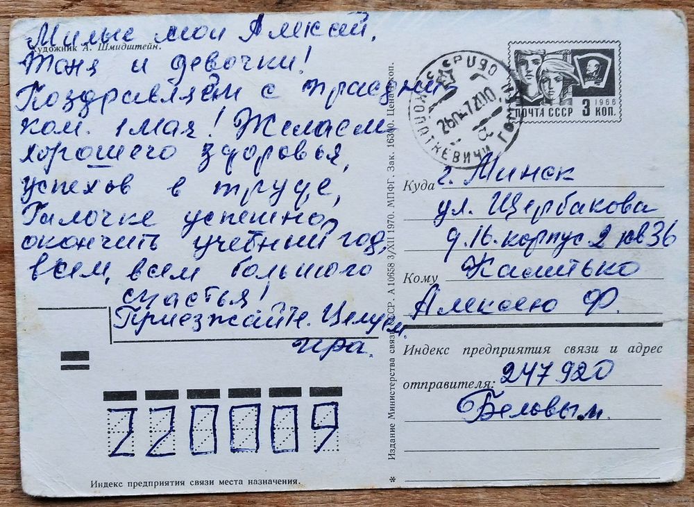 Шмидштейн А. С праздником 1 мая. ПК. Прошла почту.