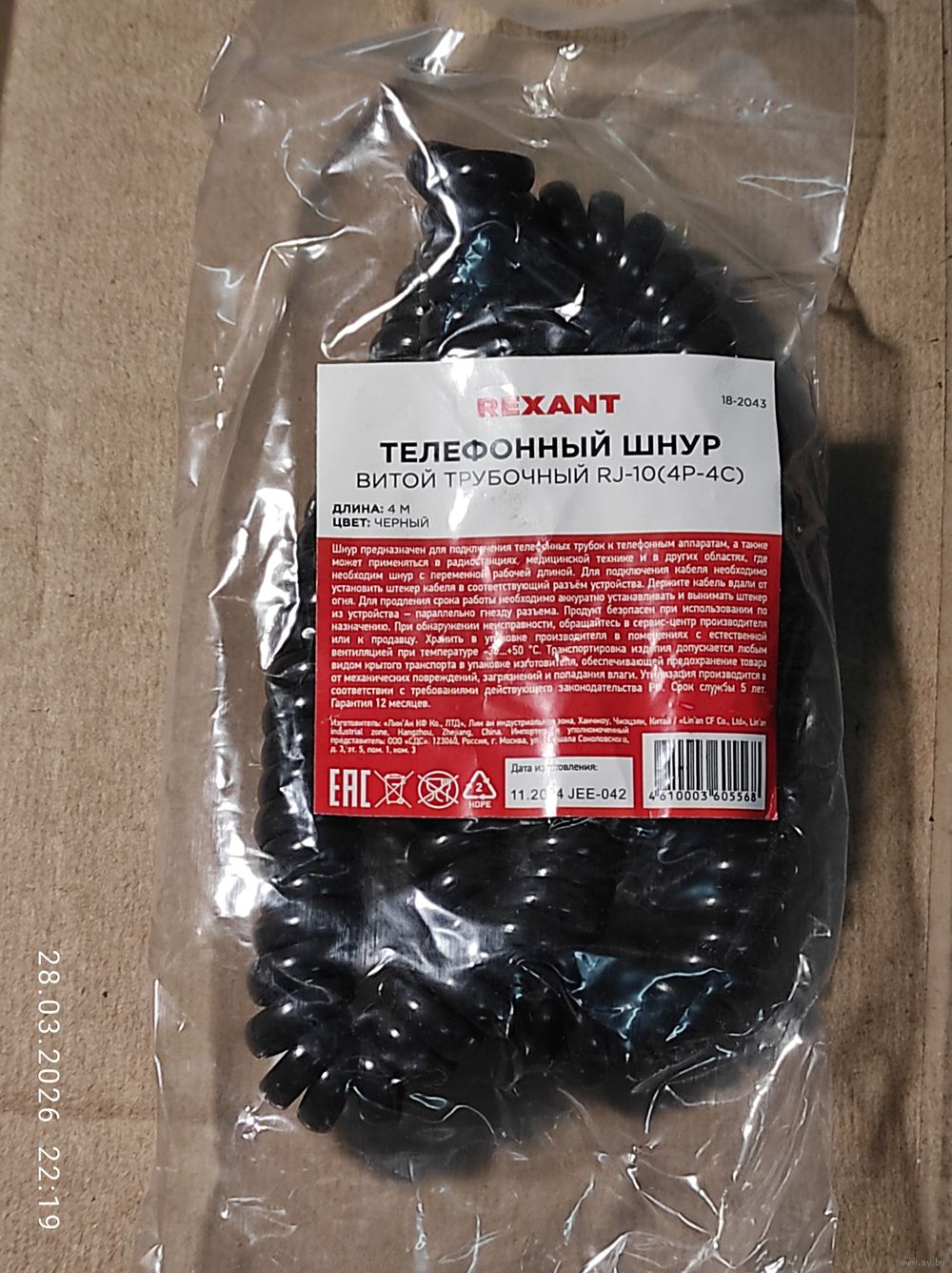 Шнур витой для телефонной трубки L=4м, 4р4с черный REXANT
