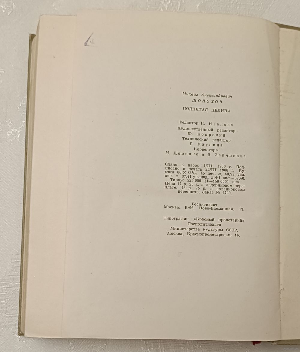 Шолохов Михаил. Поднятая целина. М.: Государственное издательство художественной литературы, 1960.- 718 с., твердый переплет, обычный формат.