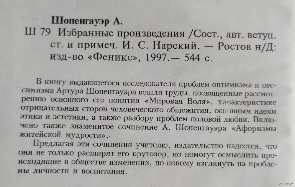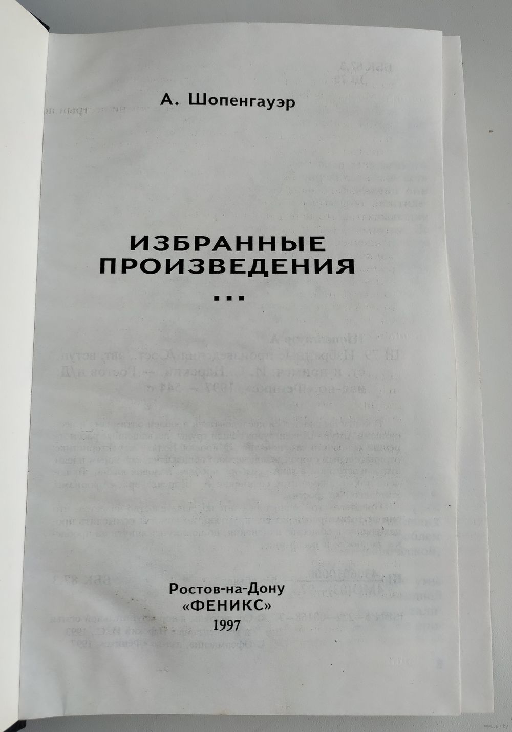 Шопенгауэр Артур. Избранные произведения. Серия: Выдающиеся мыслители. Составитель, автор вступительной статьи и примечаний профессор И.С.Нарский. Ростов-на-Дону: Феникс, 1997г., 544с. Твёрдый переплёт, обычный формат.