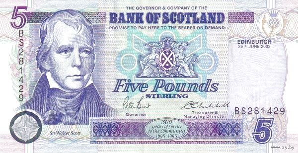 Шотландия 5 фунтов образца 2002 года UNC P119d серия CB юбилейка редкая