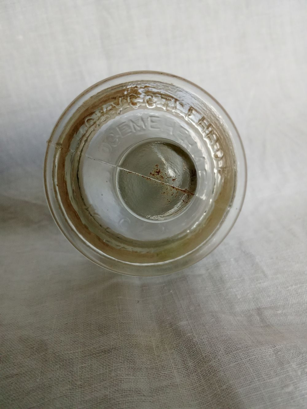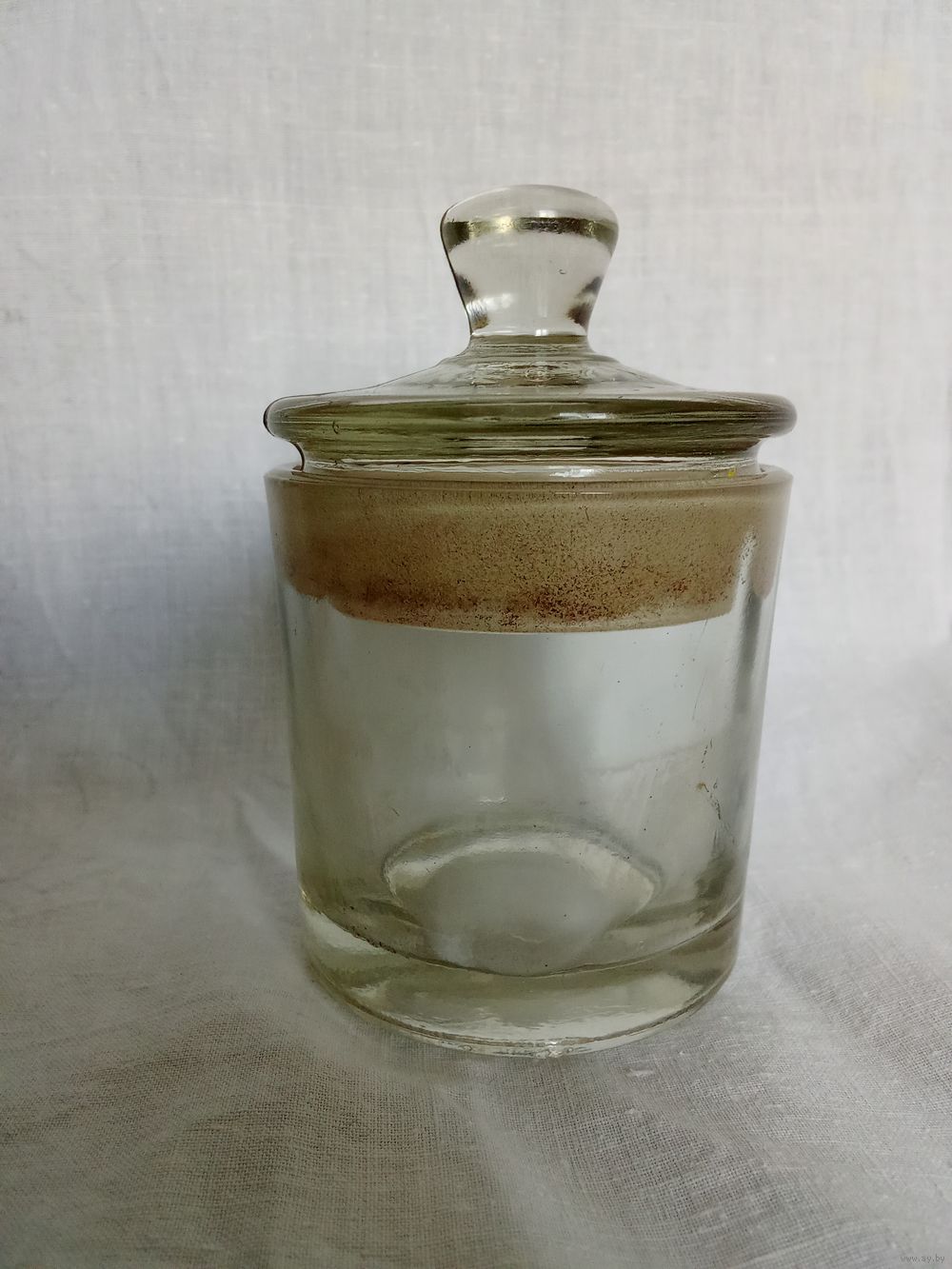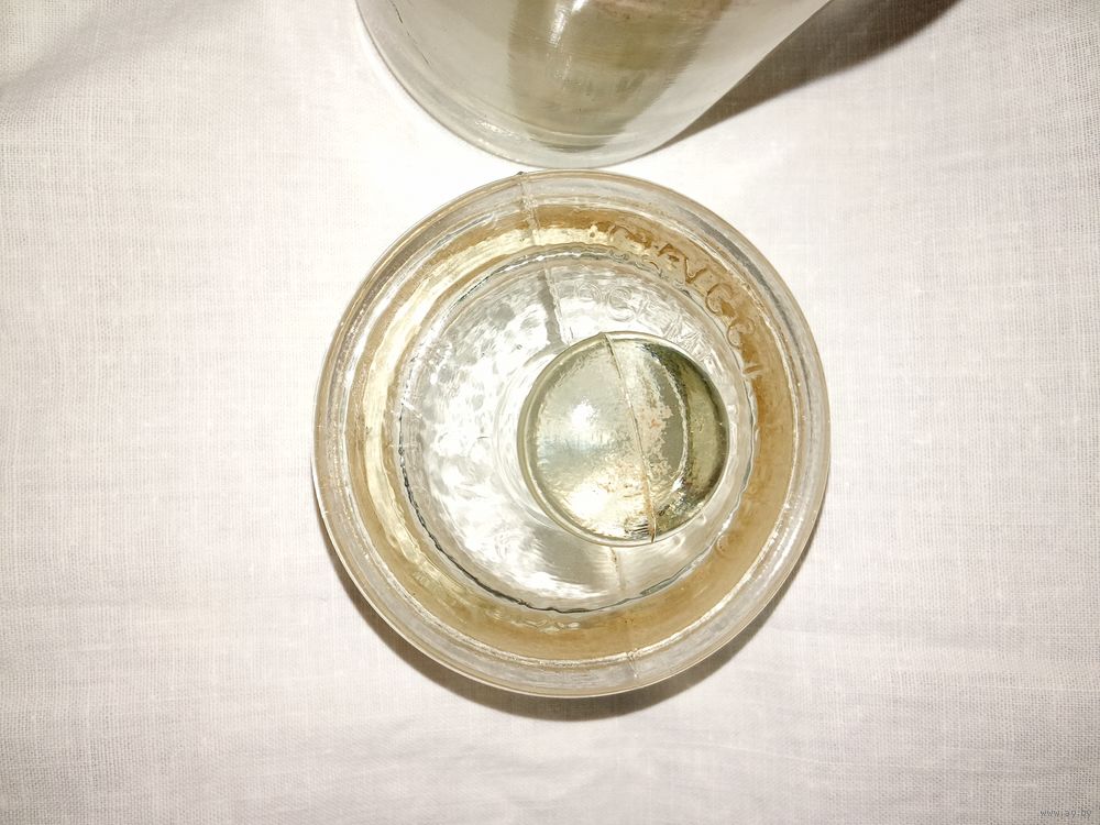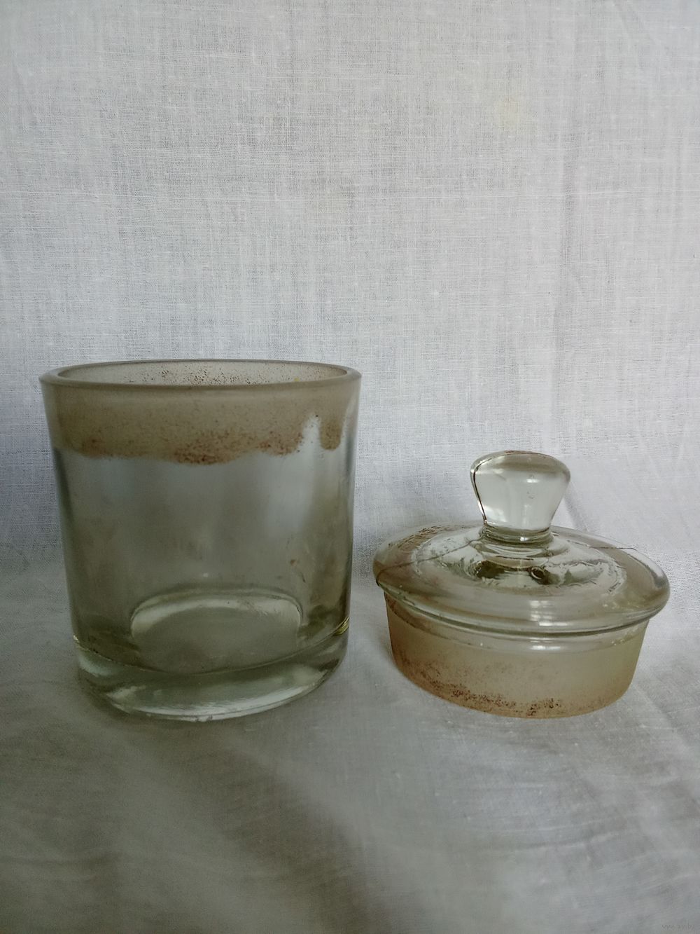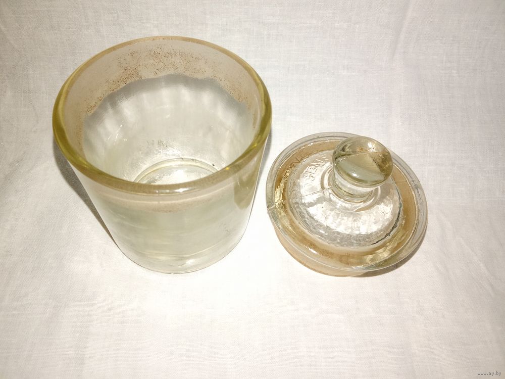 Темная полоса на банке и крышке – это след «притертости» крышки к сосуду. Высота по верху крышки 10.5 см. Диаметр емкости 5.9(низ)-6.6(верх) см. Изъянов нет. Состояние хорошее.