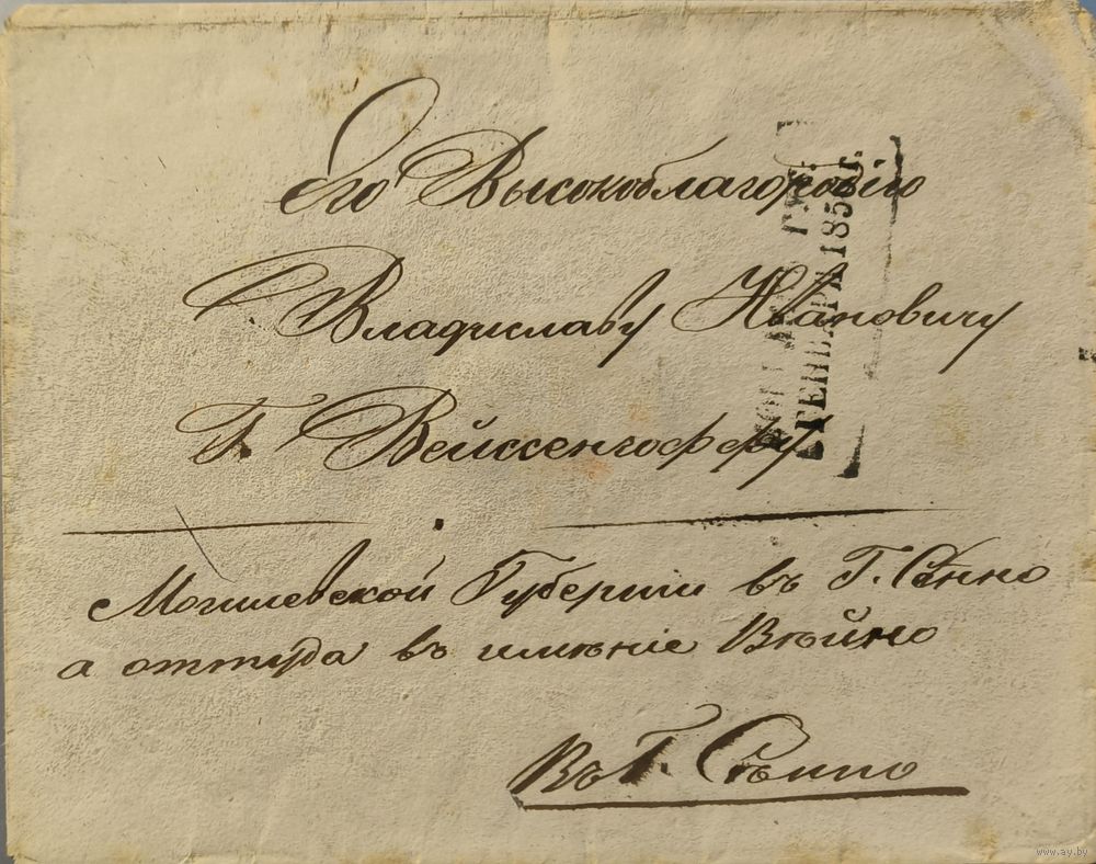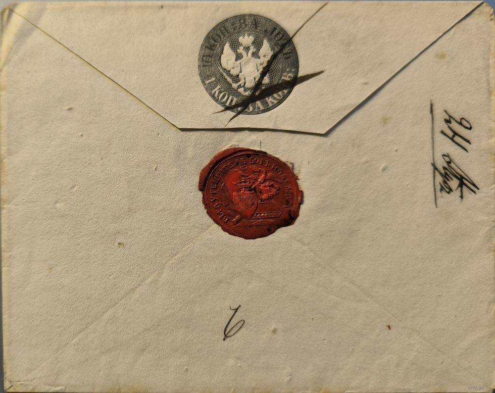 Штемпельный конверт Российской Империи. 10(+1) коп (Илюшин № 8). Четвертый выпуск (1855г). Отправлено в г. Сенно (Могилевской губ) (январь1856г). Сургучная печать.