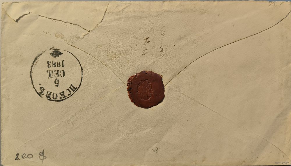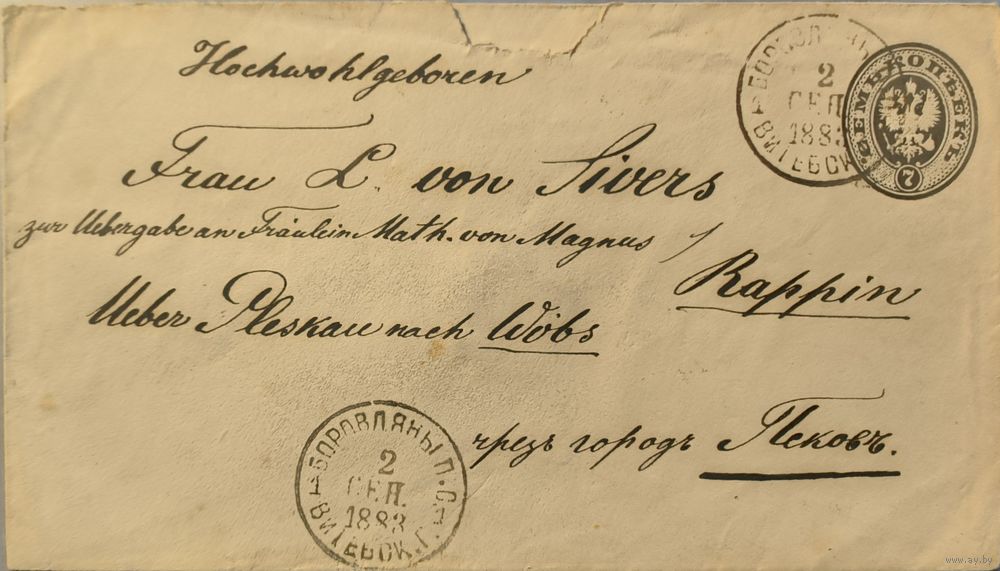 Штемпельный конверт Российской Империи. 7 коп (Илюшин № 32в). Седьмой выпуск (1879г). Отправлено из г. Боровляны (Витебской губ) (02.09.1883г) в г. Раппин. Сургучная печать.