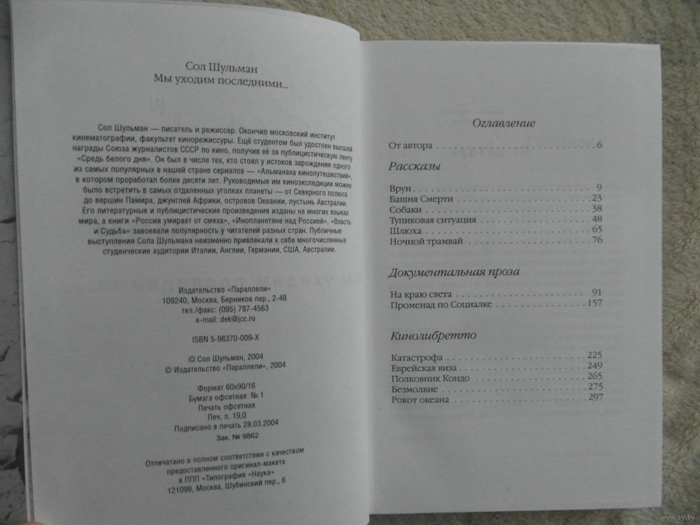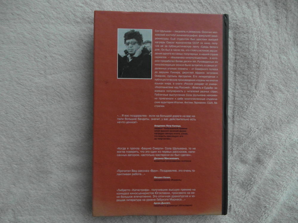 Сол Шульман - писатель и режиссер. Окончил московский институт кинематографии, факультет кинорежиссуры. Еще студентом был удостоен высшей награды Союза журналистов СССР по кино, получив ее за публицистическую ленту `Средь белого дня`. Он был в числе тех, кто стоял у истоков зарождения одного из самых популярных в нашей стране сериалов - `Альманаха кинопутешествий`, в котором проработал более десяти лет. Руководимые им киноэкспедиции можно было встретить в самых отдаленных уголках планеты - от Северного полюса до вершин Памира, джунглей Африки, островов Океании, пустынь Австралии. Его литературные и публицистические произведения изданы на многих языках мира, а книги `Россия умирает от смеха`, `Инопланетяне над Россией`. `Власть и Судьба` завоевали популярность у читателей разных стран. Публичные выступления Сола Шульмана неизменно привлекали к себе многочисленные студенческие аудитории Италии, Англии, Германии, США, Австралии. СОДЕРЖАНИЕ. От автора c. 6-8 Рассказы Врун c. 9-22 Башня Смерти c. 23-37 Собаки c. 38-47 Тупиковая ситуация c. 48-64 Шлюха c. 65-75 Ночной трамвай c. 76-90 Документальная проза На краю света c. 91-156 Променад по Социалке c. 157-224 Кинолибретто Катастрофа c. 225-248 Еврейская виза c. 249-264 Полковник Кондо c. 265-274 Безмолвие c. 275-296 Рокот океана c. 297-304
