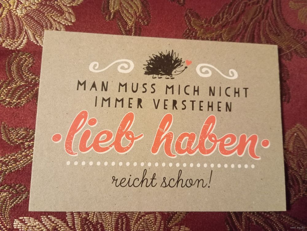 Текст на открытке на немецком языке переводится как: «Меня не всегда нужно понимать, достаточно просто любить». Эта фраза, часто сопровождаемая милыми иллюстрациями животных (как на изображении с ёжиком), используется на различных товарах, таких как открытки, кружки, магниты и сувениры, подчеркивая важность принятия и привязанности над полным пониманием. Это выражение широко распространено как душевное и юмористическое послание друзьям, партнерам или членам семьи. Оно не имеет конкретного известного происхождения, но часто встречается в продуктах немецкой "Grafik Werkstatt" или на платформах, подобных Etsy, как популярный афоризм.